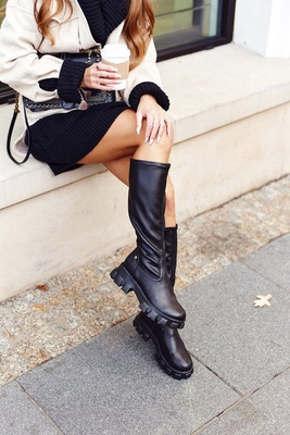 Damskie Kozaki Płaski Obcas Sergio Leone Ocieplane Czarne KZ280