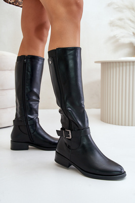 Kozaki Eko Skóra Płaski Obcas Złota Klamra Ocieplane Czarne Arsisna