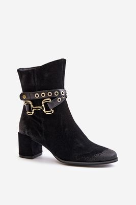Damskie Botki Z Naturalnego Zamszu Na Obcasie Słupku Z Ozdobnym Paskiem Czarne Maciejka 06679-01