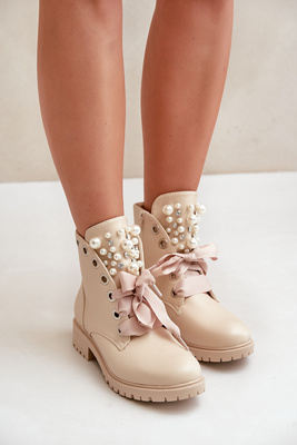 Botki Z Perełkami Dżetami I Wstążką Beżowe Nudago