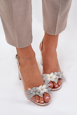 Transparentne Sandały Z Ozdobnymi Kwiatkami Na Obcasie Słupku Srebrne D&A MR38-331