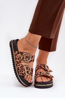 Klapki Damskie Ze Złotymi Klamrami Eko Skórzane Na Platformie Panterka Brązowe Tersele
