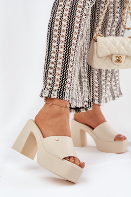 Klapki Damskie Eko Skórzane Na Platformie I Słupku Jasnobeżowe Tamirella
