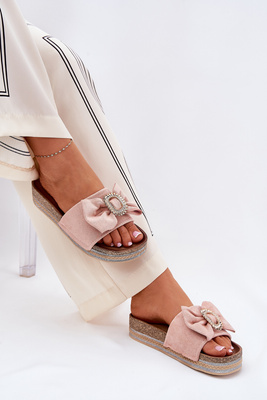 Klapki Damskie Z Kokardką I Ozdobną Broszką Na Platformie Różowe Lenela