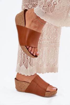 Klapki Damskie Na Korkowym Koturnie Skórzane Brązowe Zazoo 40291