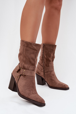 Ocieplane Botki Damskie Obcas Słupek Paski Ozdobny Detal Brązowe Neria