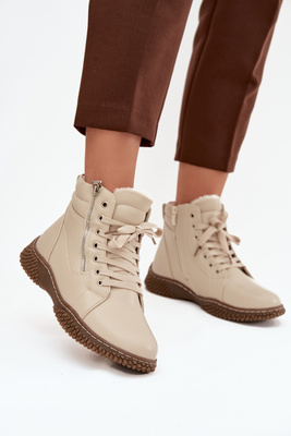 Damskie Botki Eko Skórzane Ocieplane Futerkiem Na Zamek Beżowe Ulverina