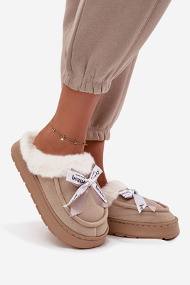 Damskie Kapcie Na Grubej Podeszwie Z Kokardką I Futerkiem Beżowe Fenella