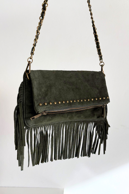 Mała Torebka Z Naturalnego Zamszu Frędzle Łańcuszek Ciemnozielona Narella