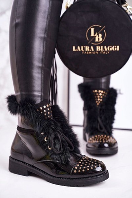 Damskie Ocieplane Botki Z Dżetami I Futerkiem Lakierowane Glam
