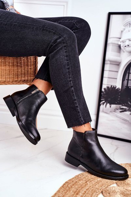Botki Damskie Ciepłe Sztyblety Płaski Obcas Skóra Czarne Fernir