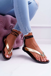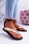 Sandały Lu Boo to czarne japonki z gumowymi paskami, wiązane, o niskim obcasie, wykonane z dbałością o krój i szycie.