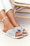 Klasyczne klapki o modnym fasonie pasują do wielu stylizacji! Idealne dla każdej kobiety ceniącej sobie komfort i wygodę na co dzień. Świetnie sprawdzą się w cieplejsze dni. Wykonane z eko zamszu. Model klasyczny, wsuwany. Buty osadzone na korkowej platformie. Nosek odkryty, zaokrąglony. Modna kokarda ozdabia przód obuwia. Koniecznie powinnaś mieć ten model w swojej szafie!