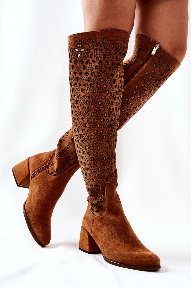 Kozaki na obcasie świetnie sprawdzą się w wielu stylizacjach. Wyjątkowy fason zachwyci każdego! Kozaki są stabilne oraz wygodne w użytkowaniu. Musisz je mieć w swojej szafie ! Wykonane z naturalnego zamszu w ażurowy wzór. Na całej długości zapinane na suwak. Model z noskiem w szpic. Miękka wkładka została wykonana z naturalnej skóry. Zapiętek usztywniany. Buty są wykonane z wysokiej jakości skóry z dbałością o szczegóły. Obcas w postaci szerokiego słupka świetnie wysmukli nogi.