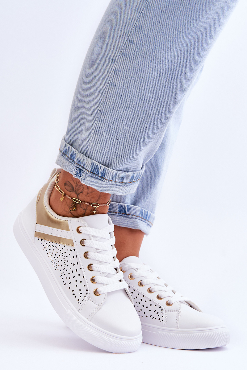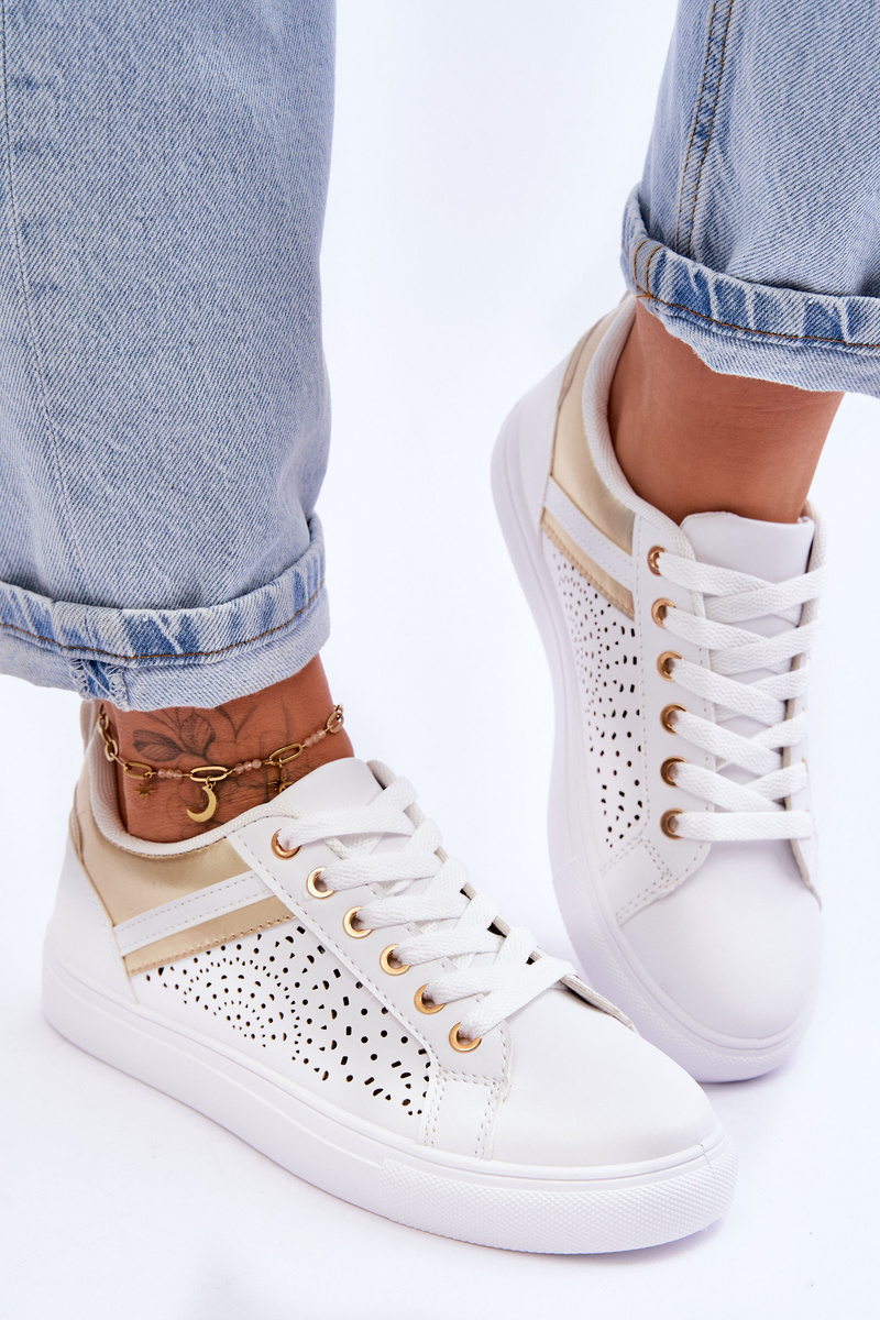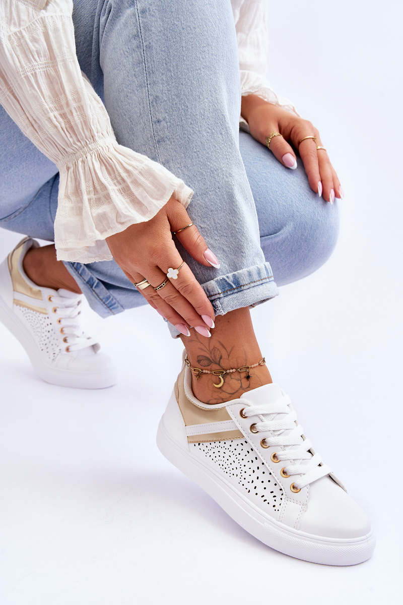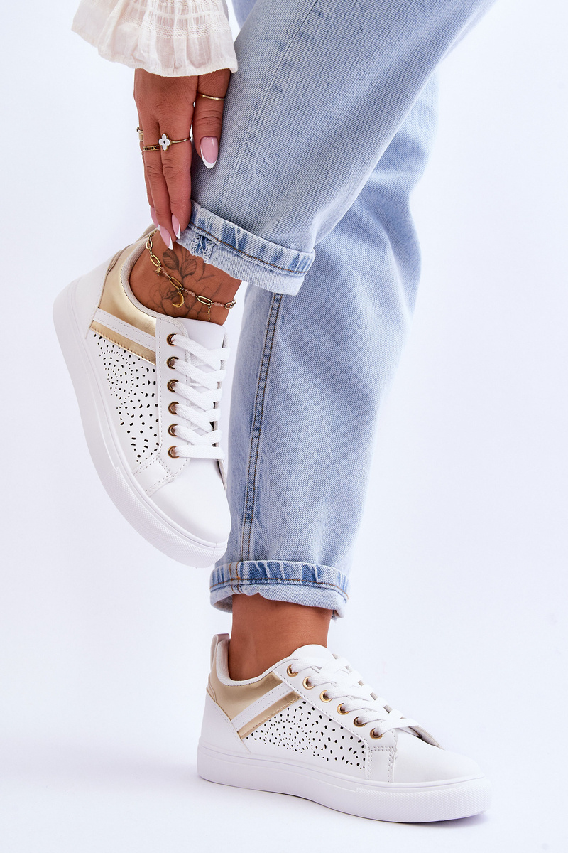 portowe Buty Klasyczne Ażurowy Wzór Białe-Złote Happier