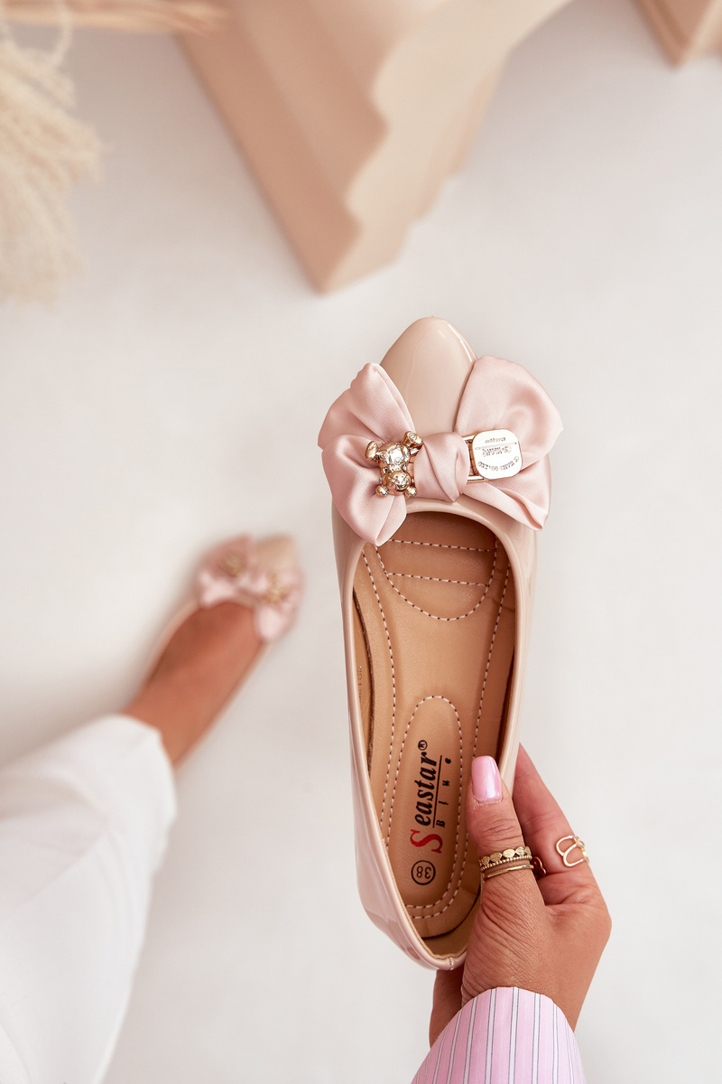 Baleriny Lakierowane Damskie Kokardka Złota Broszka Beżowe Rivona