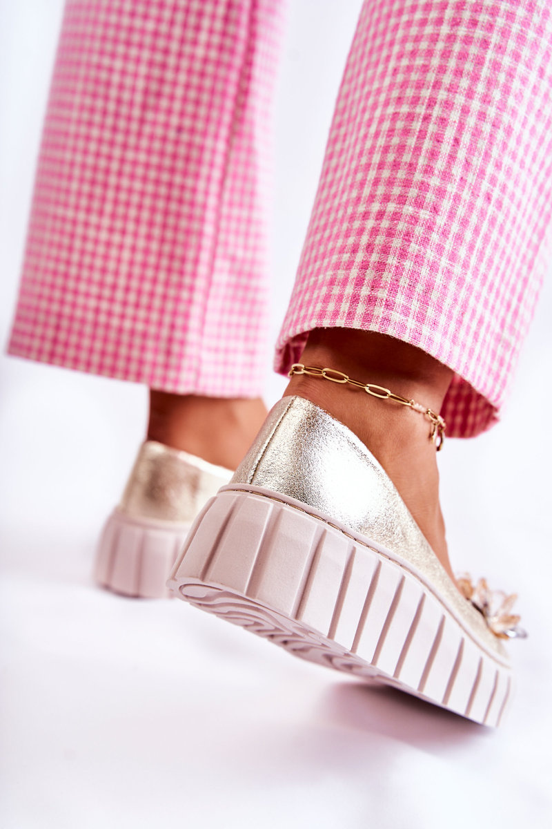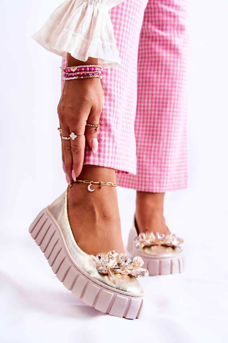 Baleriny Skórzane Platforma Ozdoba Złote Ladette