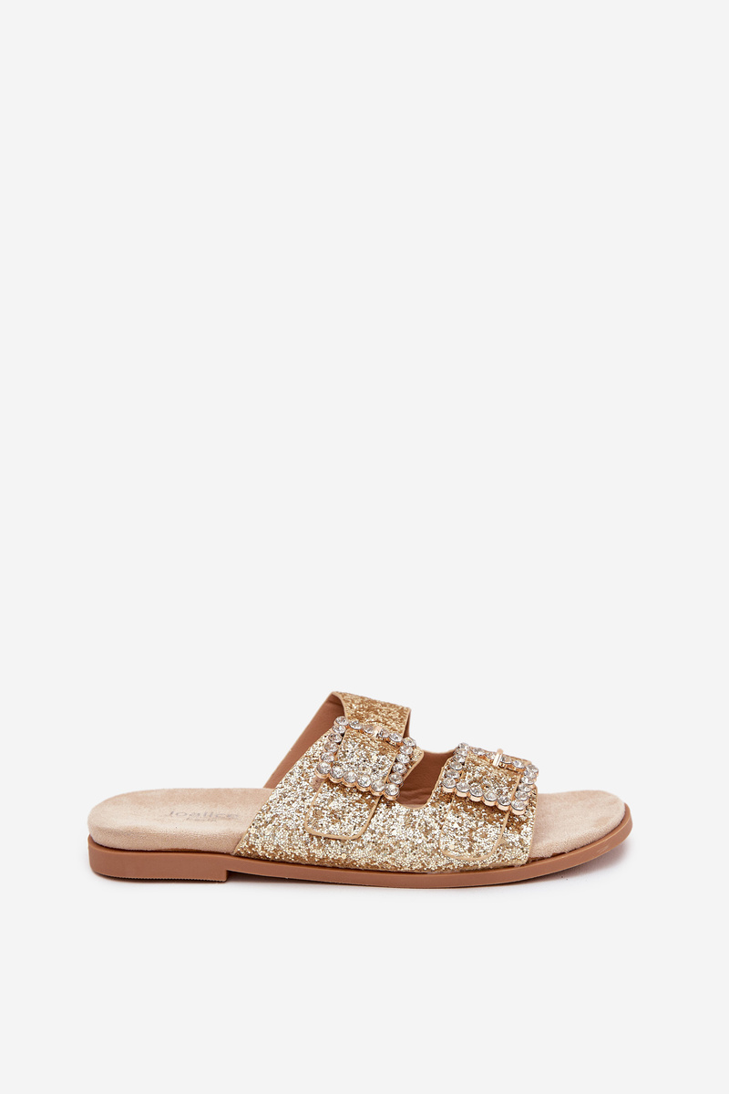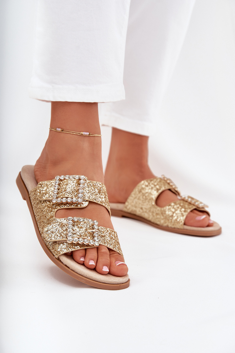 Błyszczące Damskie Klapki Płaski Obcas Zdobienie Klamry Złote Tovira