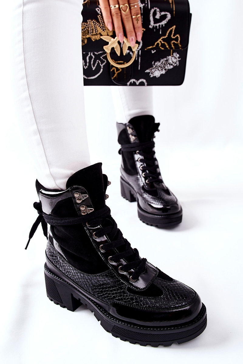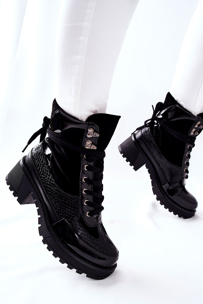 Botki wykonane z połączenia skóry ekologicznej oraz ekozamszu. Masywna platforma i dopasowana cholewka wysmuklą Twoje nogi! Przy wyborze rozmiaru prosimy sugerować się tabelą rozmiarów.