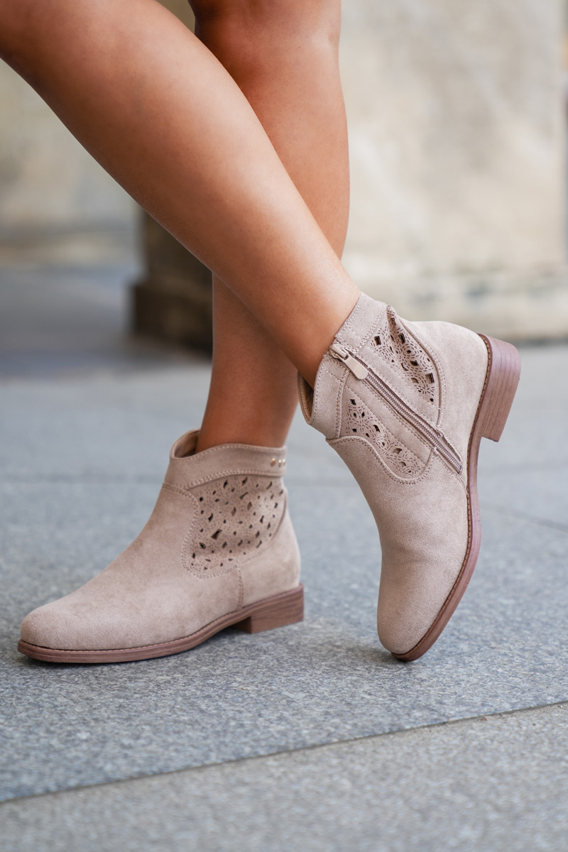 Uwielbianym i najczęściej wybieranym modelem przez kobiety są botki na płaskim, stabilnym obcasie. Posiadają wiele atutów, jednak głównym z nich jest zapewnienie wysokiego komfortu podczas noszenia. Botki wykonane z eko zamszu. Osadzone na płaskim obcasie. Noski zaokrąglone. Zapinane na zamek. Model ten wyróżnia ażurowa cholewka. Ten stylowy fason z pewnością dopełni wiele stylizacji!