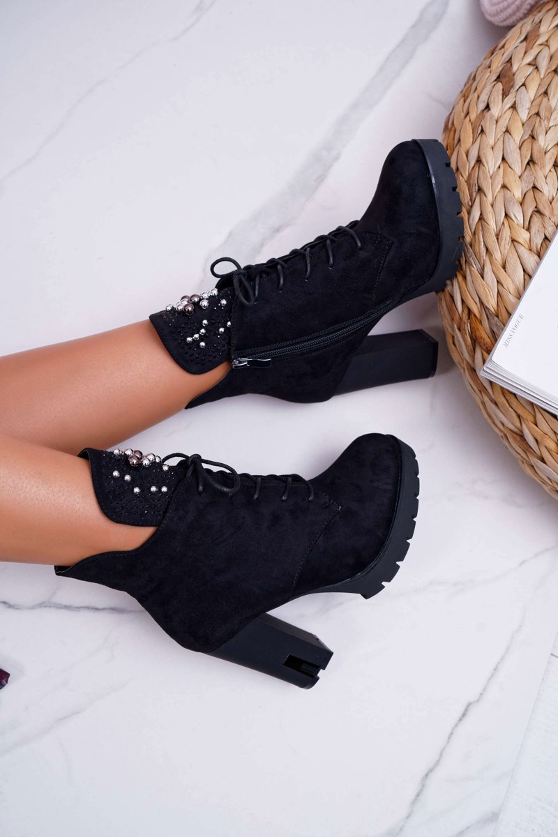 Botki Damskie na Słupku Platformie Zamszowe Czarne Fieste