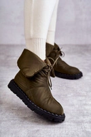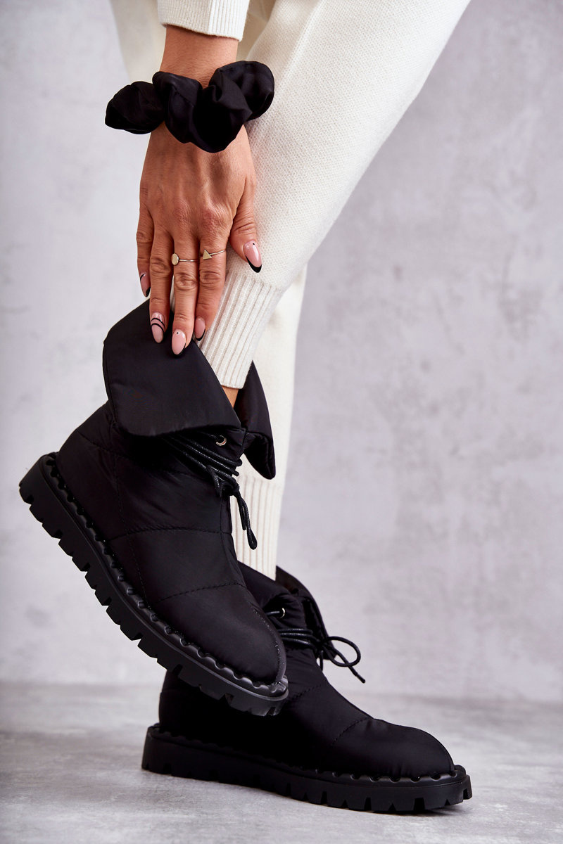 Uwielbianym i najczęściej wybieranym modelem przez kobiety są botki na płaskim, stabilnym obcasie. Posiadają wiele atutów, jednak głównym z nich jest zapewnienie wysokiego komfortu podczas noszenia. Wykonane z materiału tekstylnego odpornego na wiatr i zimno. Przeszywane nicią na całości. Model sznurowany. Modna, wywijana cholewka. Botki posiadają w środku ocieplenie w postaci koca obuwniczego. Osadzone na platformie.