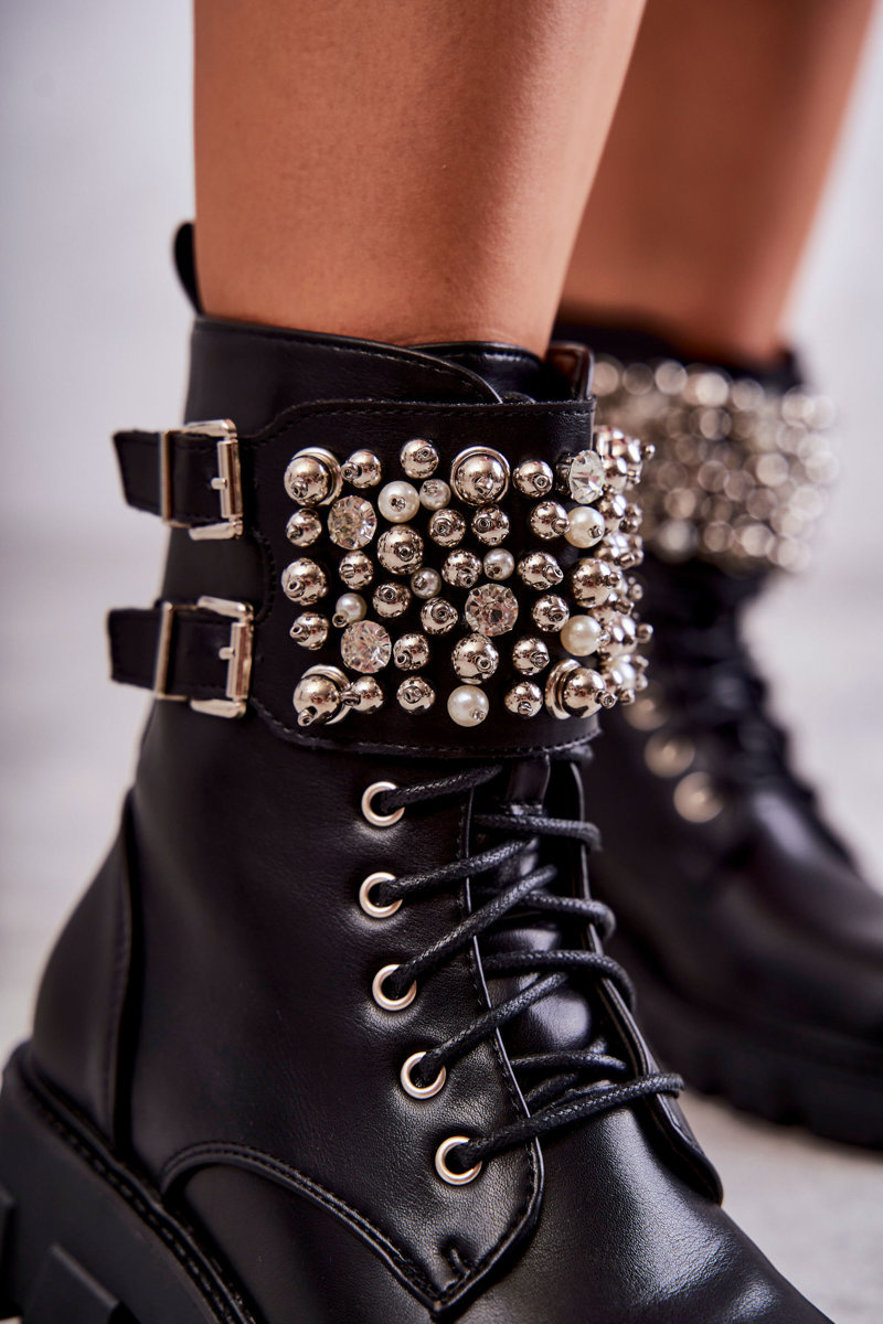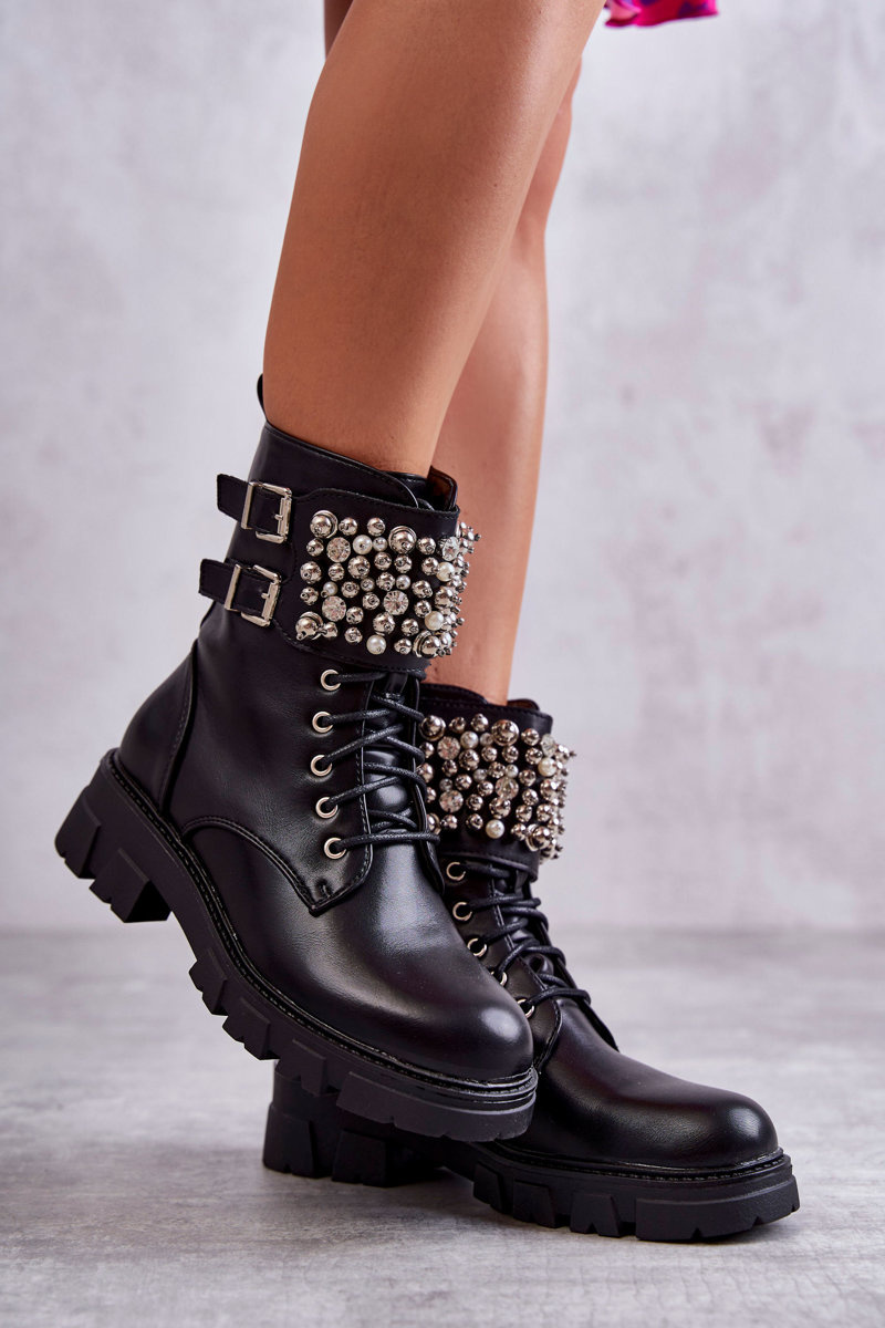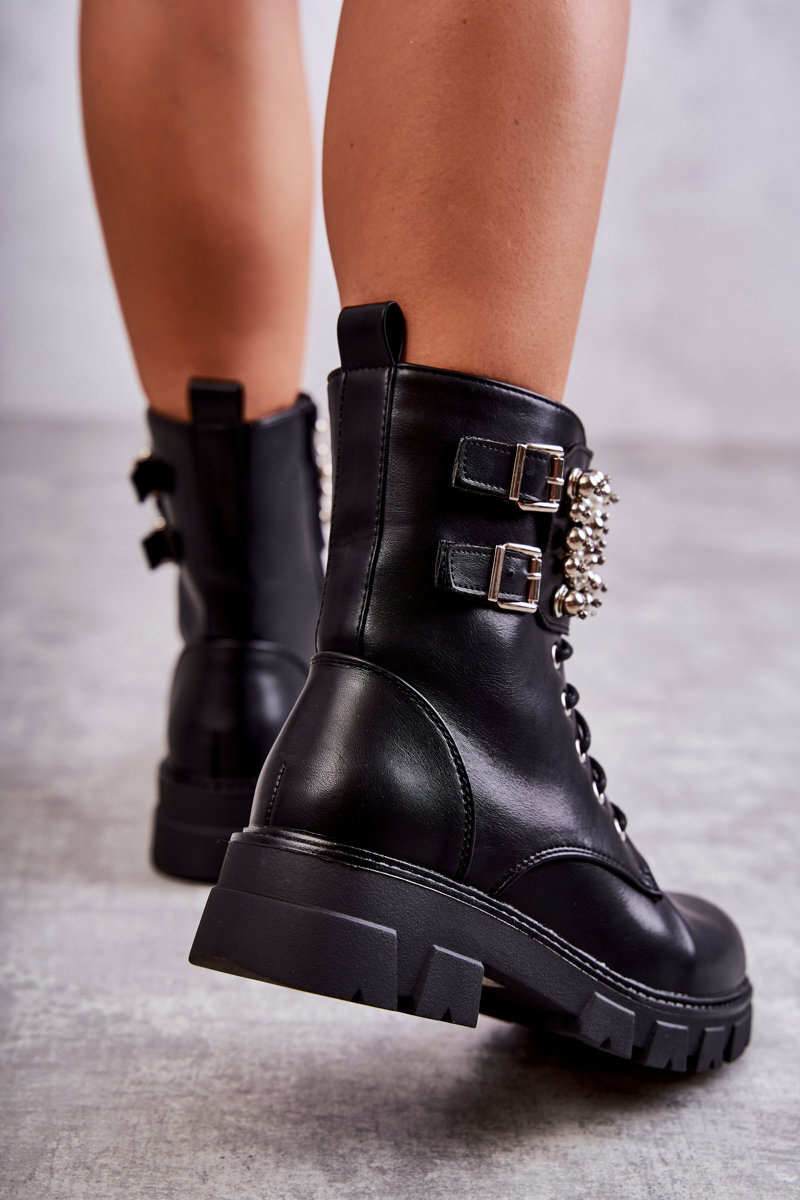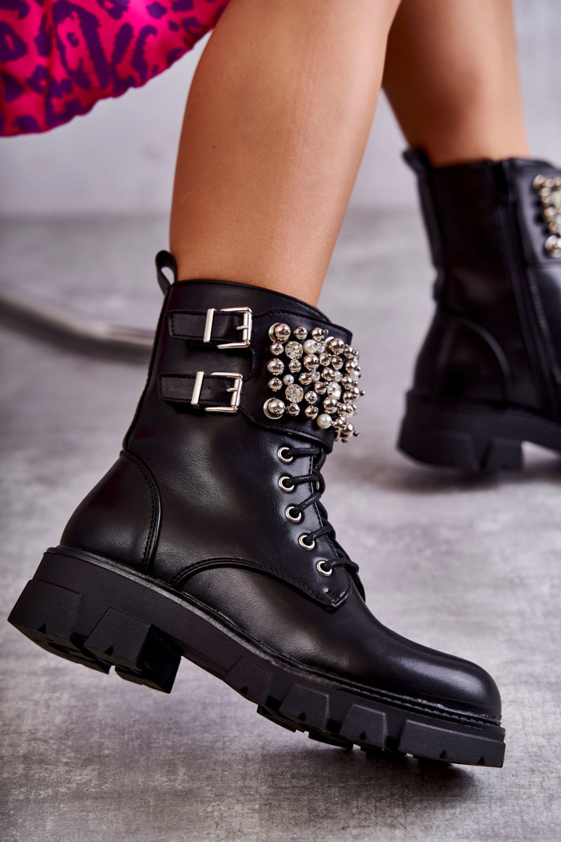 Botki Damskie Ozdoby Wiązane Czarne Leonese