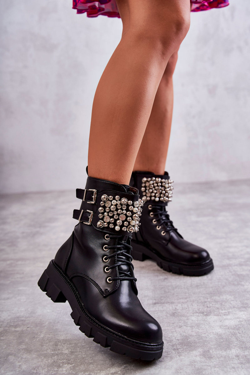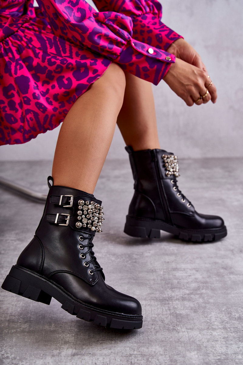Uwielbianym i najczęściej wybieranym modelem przez kobiety są botki na płaskim, stabilnym obcasie. Posiadają wiele atutów, jednak głównym z nich jest zapewnienie wysokiego komfortu podczas noszenia. Botki zostały wykonane z eko skóry. Model posiada ozdoby w postaci koralików i cyrkonii. Botki są wiązane, zapinane na suwak oraz sprzączkę. Osadzone na delikatnej platformie i płaskim obcasie. Zapiętek usztywniany. Przy wyborze rozmiaru prosimy sugerować się tabelą rozmiarów.