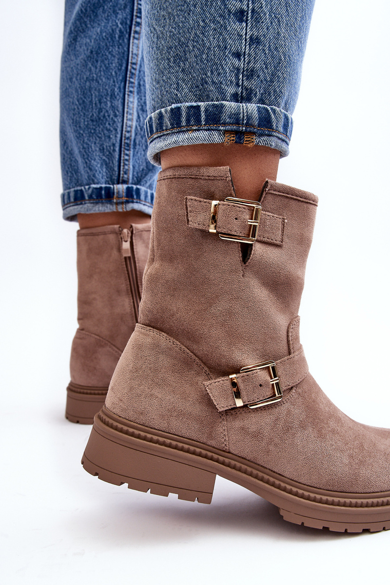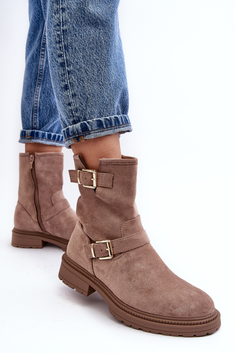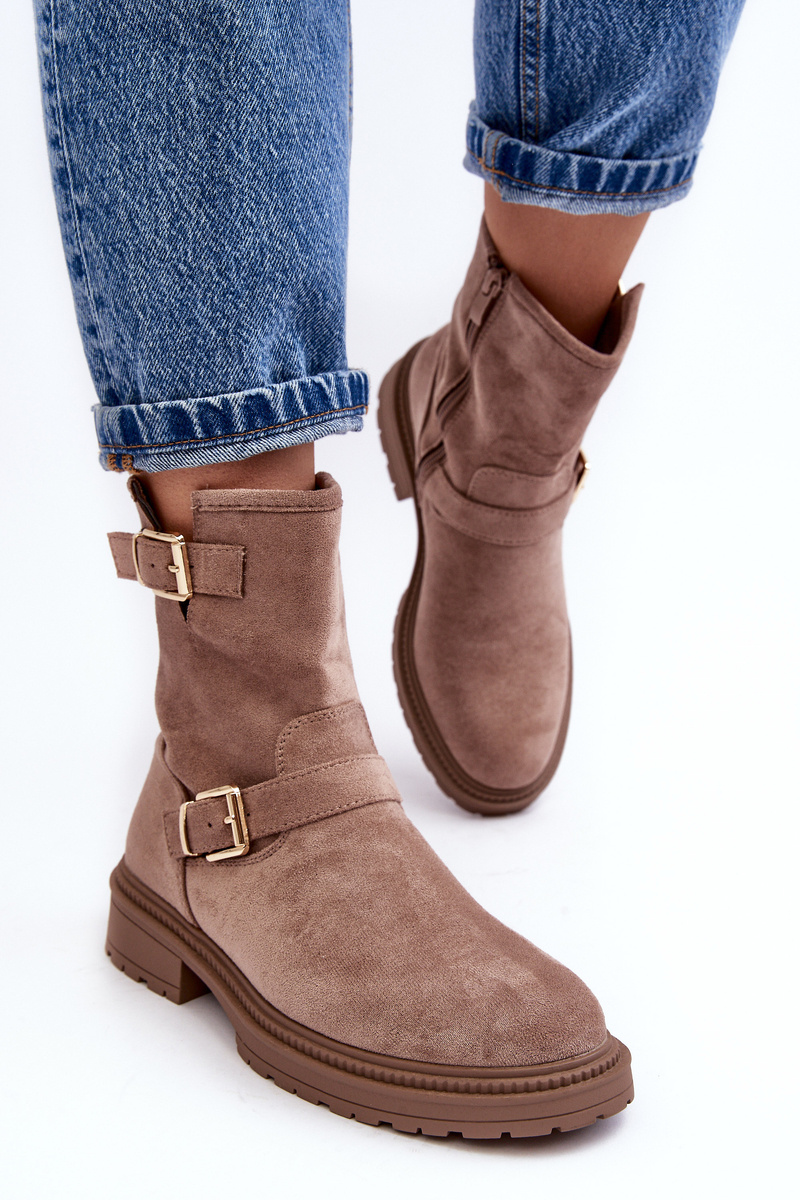 Botki Damskie Płaski Obcas Klamry Ciemnobeżowe Bliggore ML275