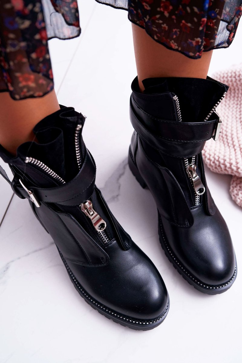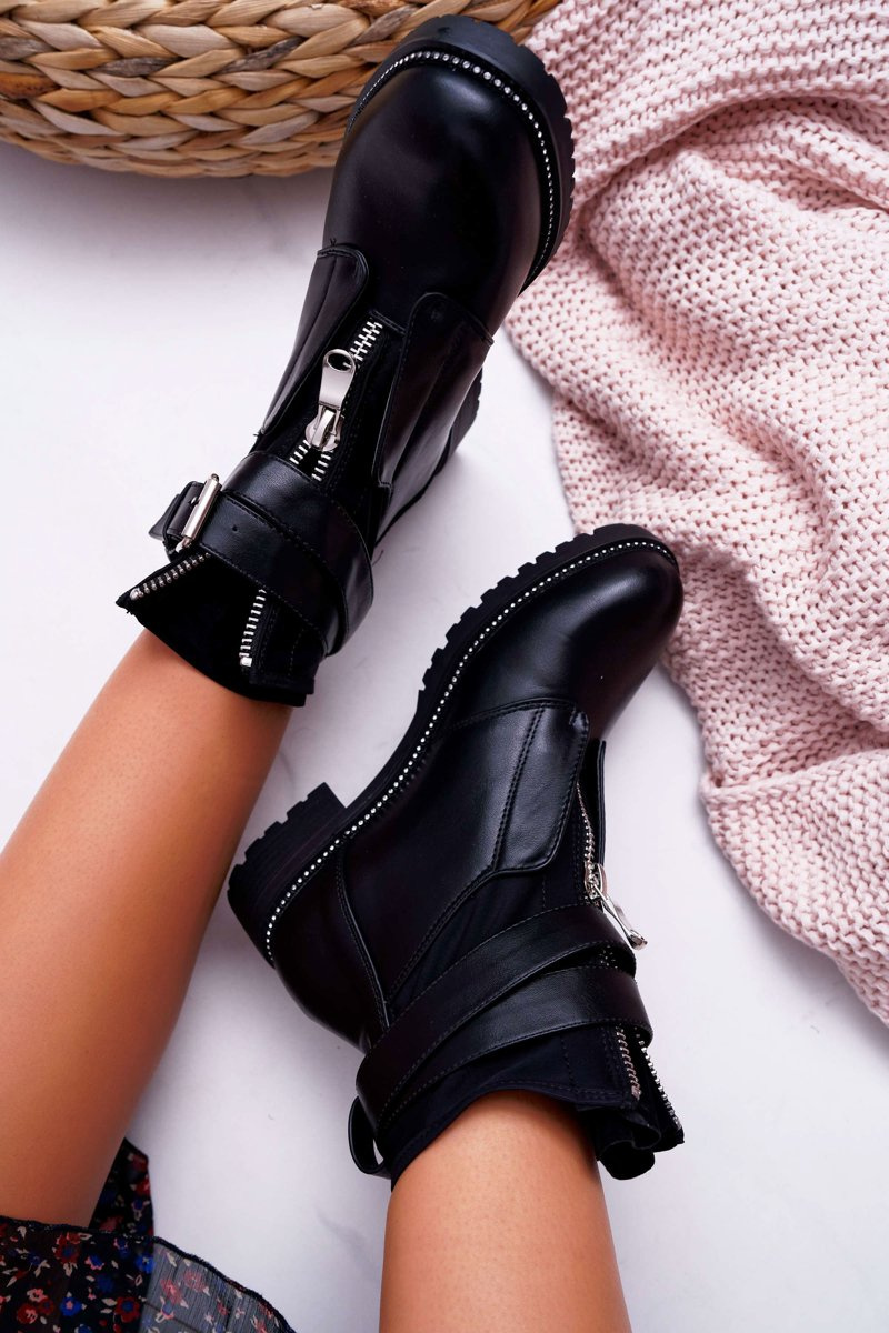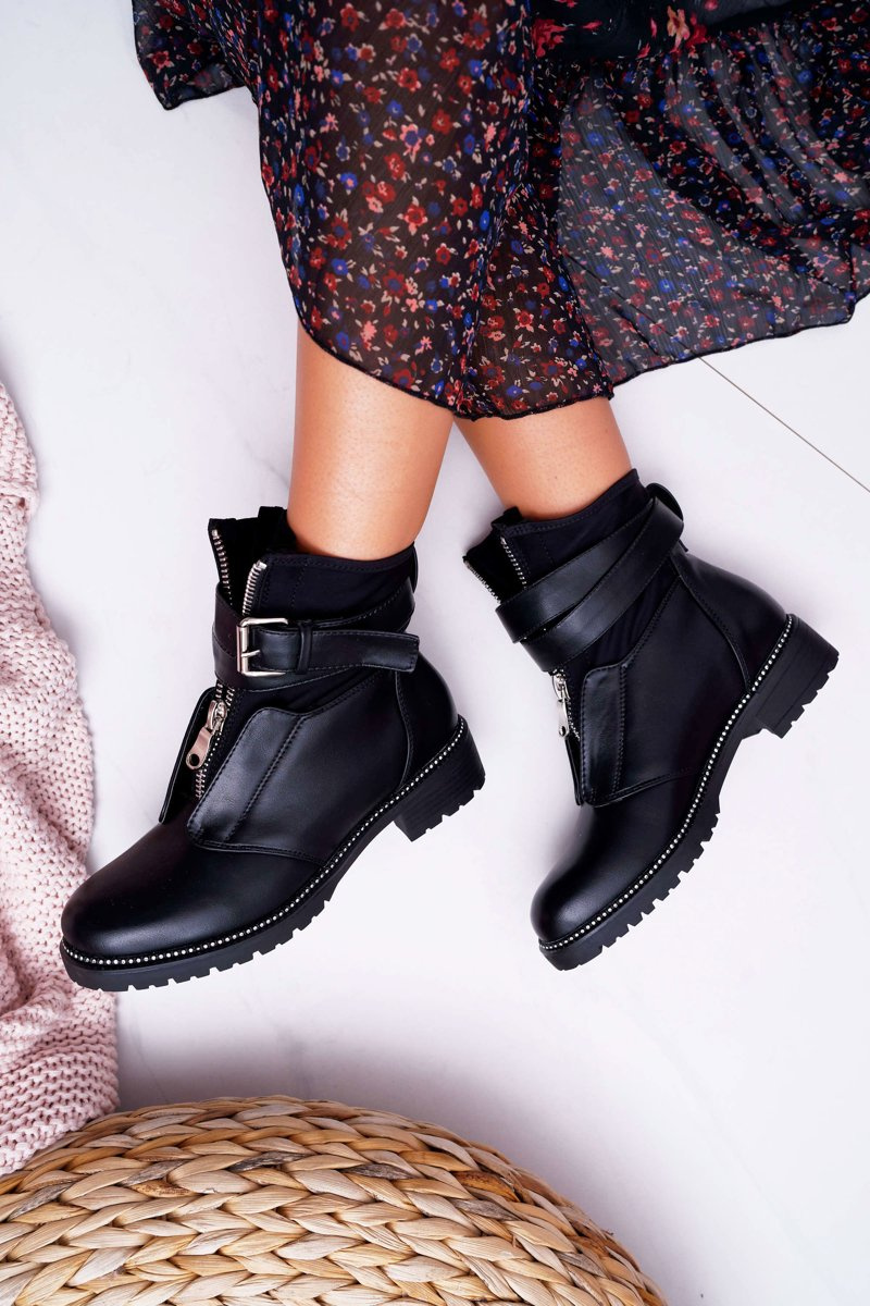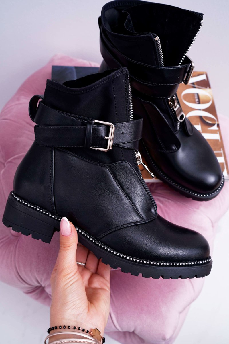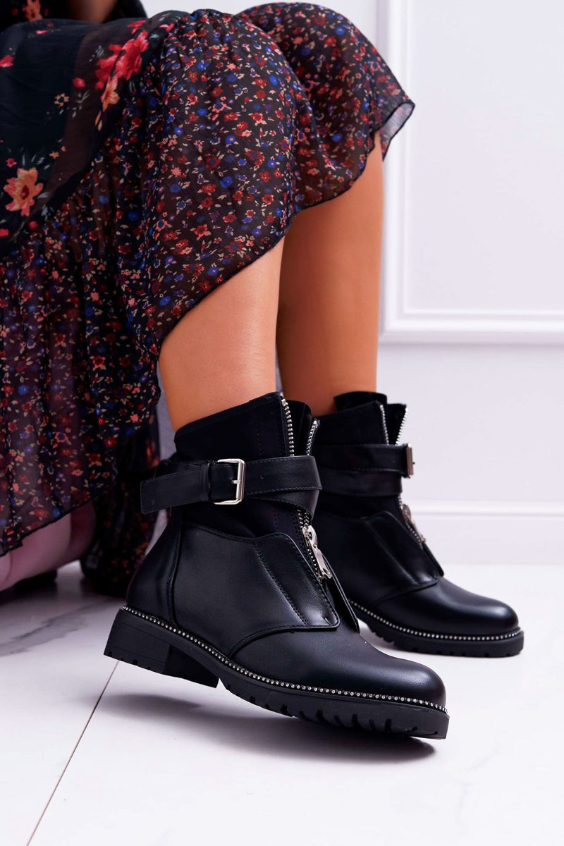 Botki Damskie Płaski Obcas Militarne Czarne Travist
