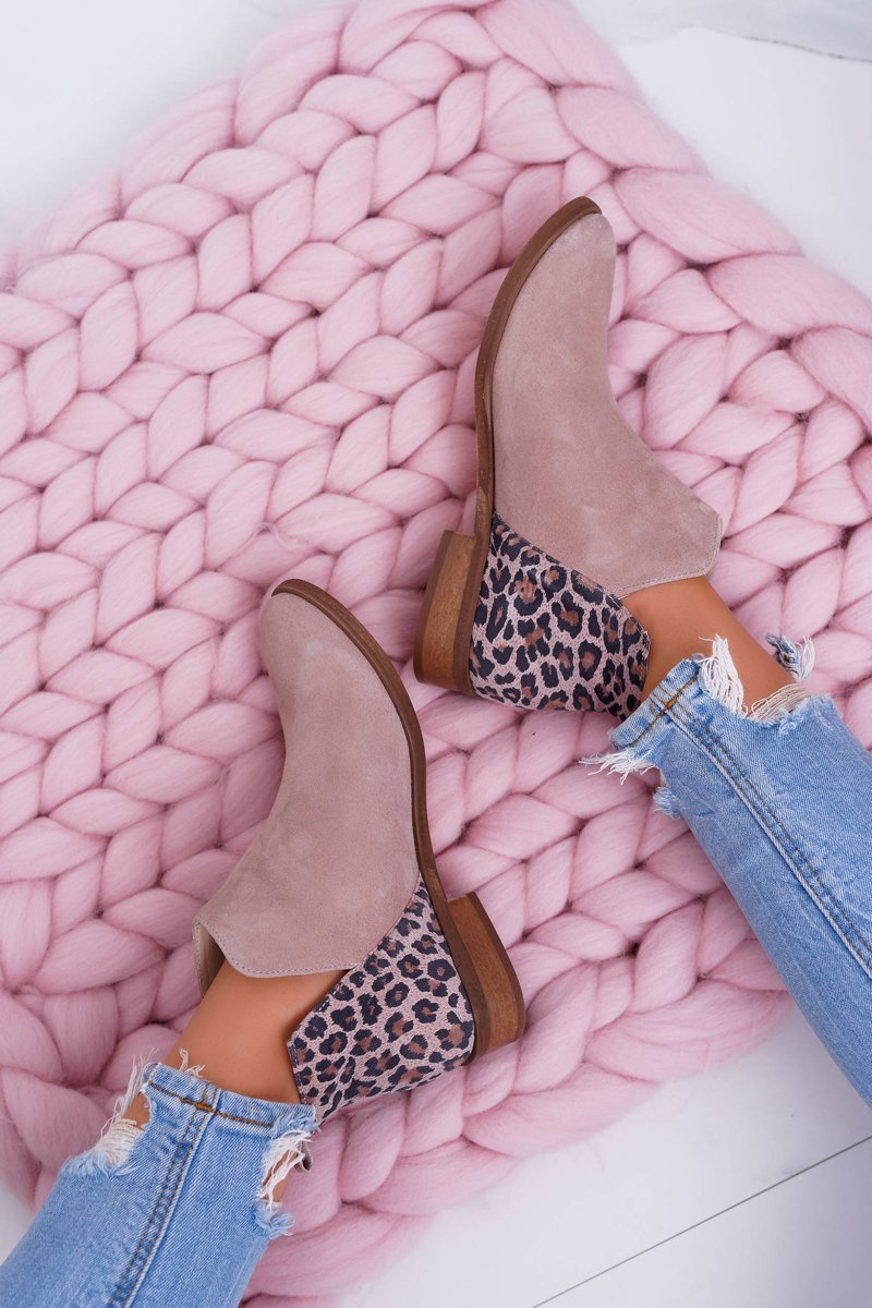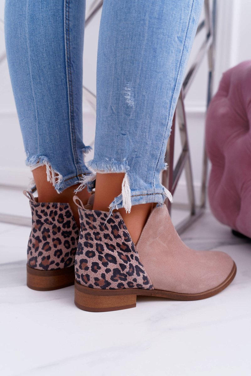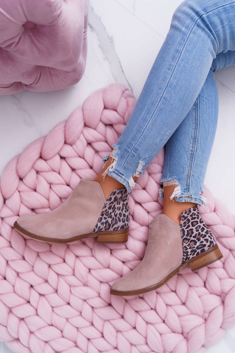 Botki to nie tylko buty na chłodne dni. Świetnie sprawdzą się również podczas tworzenia wiosennych stylizacjach. Botki posiadają delikatne wycięcia na wysokości kostek. Płaski obcas oraz wzór w panterkę, który stał się bardzo modny w tym sezonie. Botki w całości wykonane ze skóry zamszowej. Produkt Polski, co gwarantuje nam komfort oraz wysoką jakość wykonania. Idealne do zwiewnych sukienek oraz jeansowych spodni. Przy wyborze rozmiaru prosimy sugerować się tabelą rozmiarów.