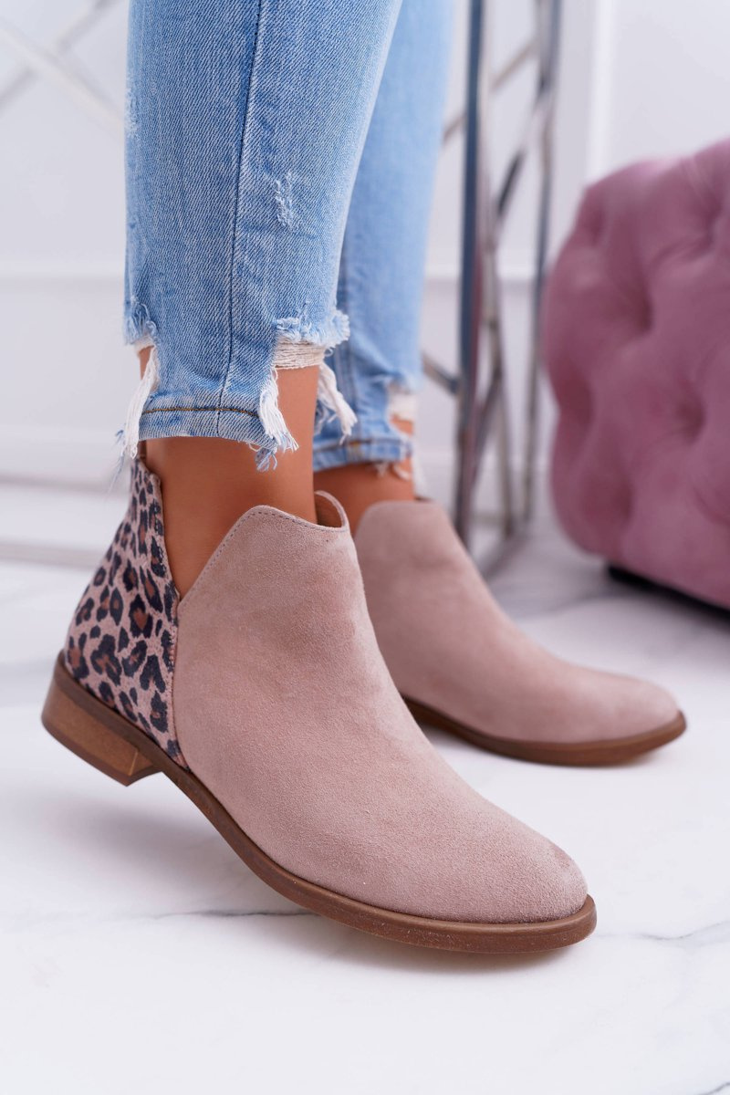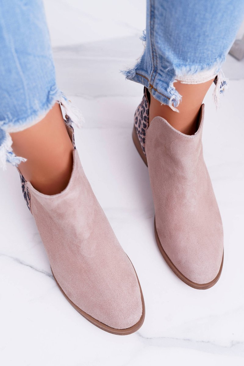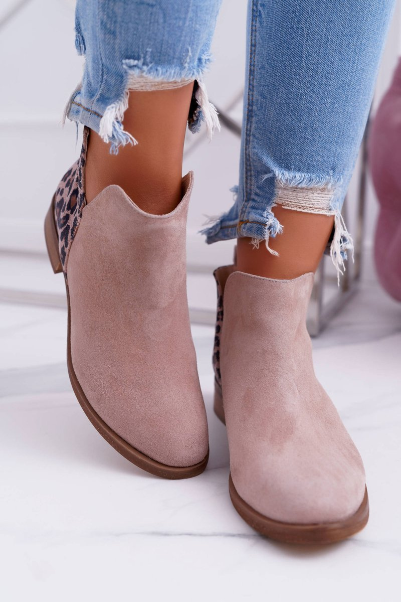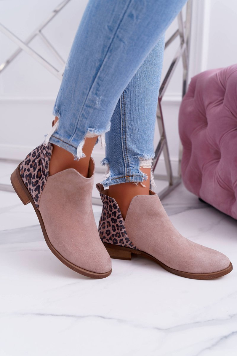 Botki to nie tylko buty na chłodne dni. Świetnie sprawdzą się również podczas tworzenia wiosennych stylizacjach. Botki posiadają delikatne wycięcia na wysokości kostek. Płaski obcas oraz wzór w panterkę, który stał się bardzo modny w tym sezonie. Botki w całości wykonane ze skóry zamszowej. Produkt Polski, co gwarantuje nam komfort oraz wysoką jakość wykonania. Idealne do zwiewnych sukienek oraz jeansowych spodni. Przy wyborze rozmiaru prosimy sugerować się tabelą rozmiarów.