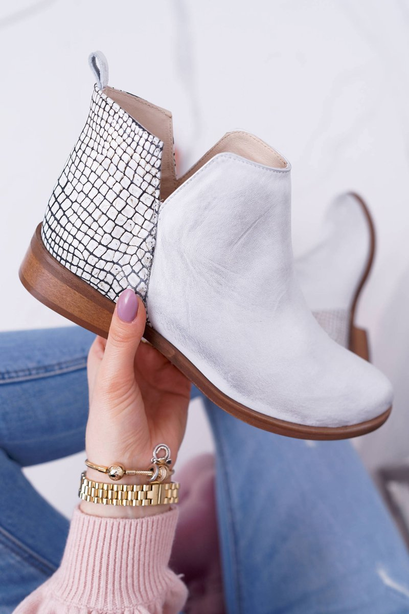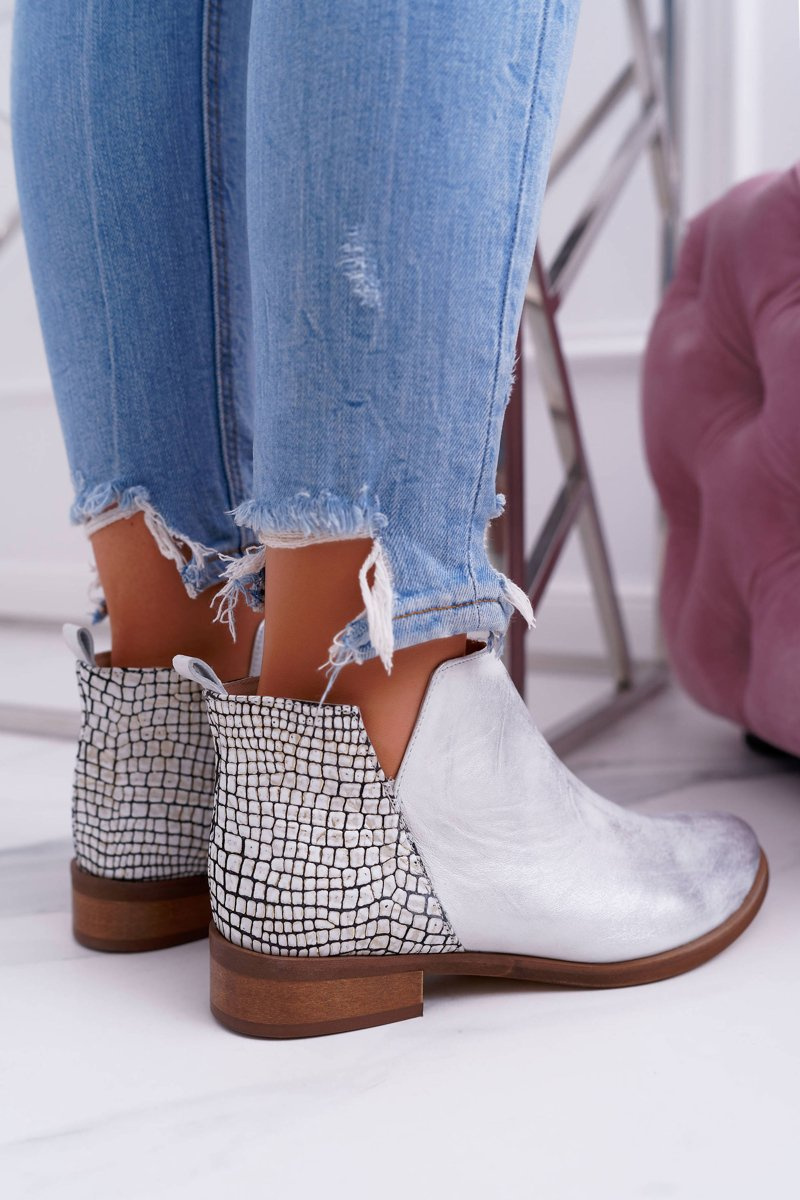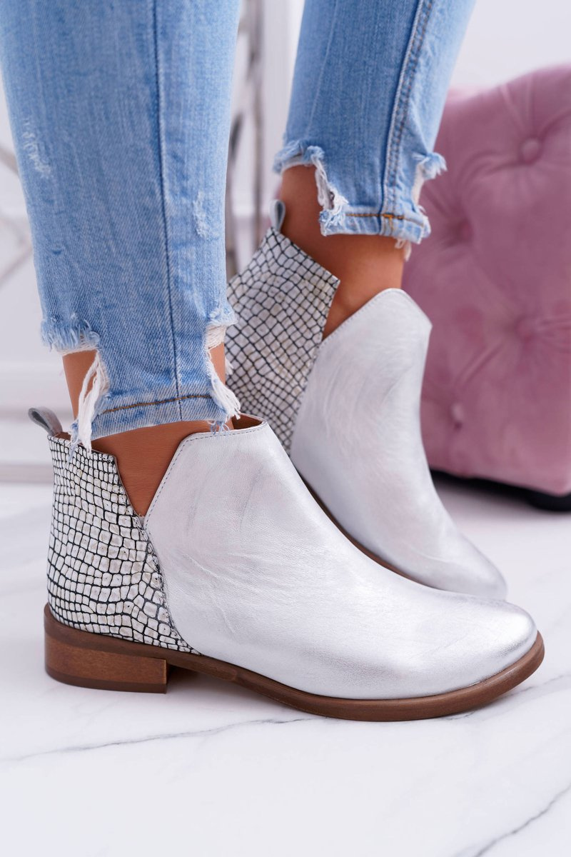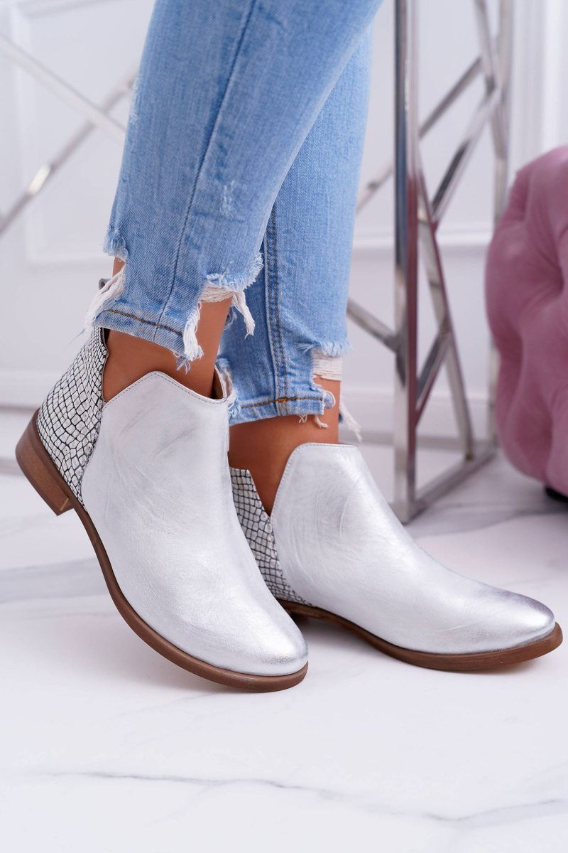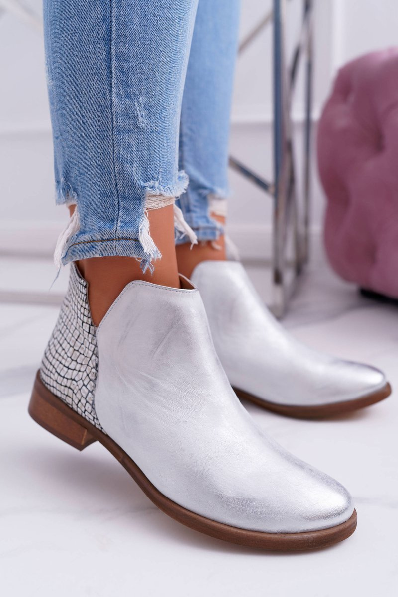 Botki Damskie Płaski Obcas Wiosenne Skórzane Srebrne Madness