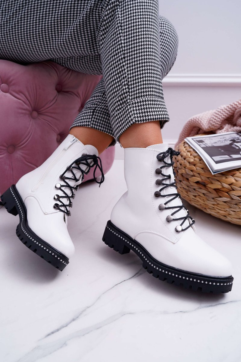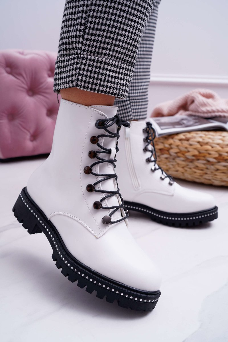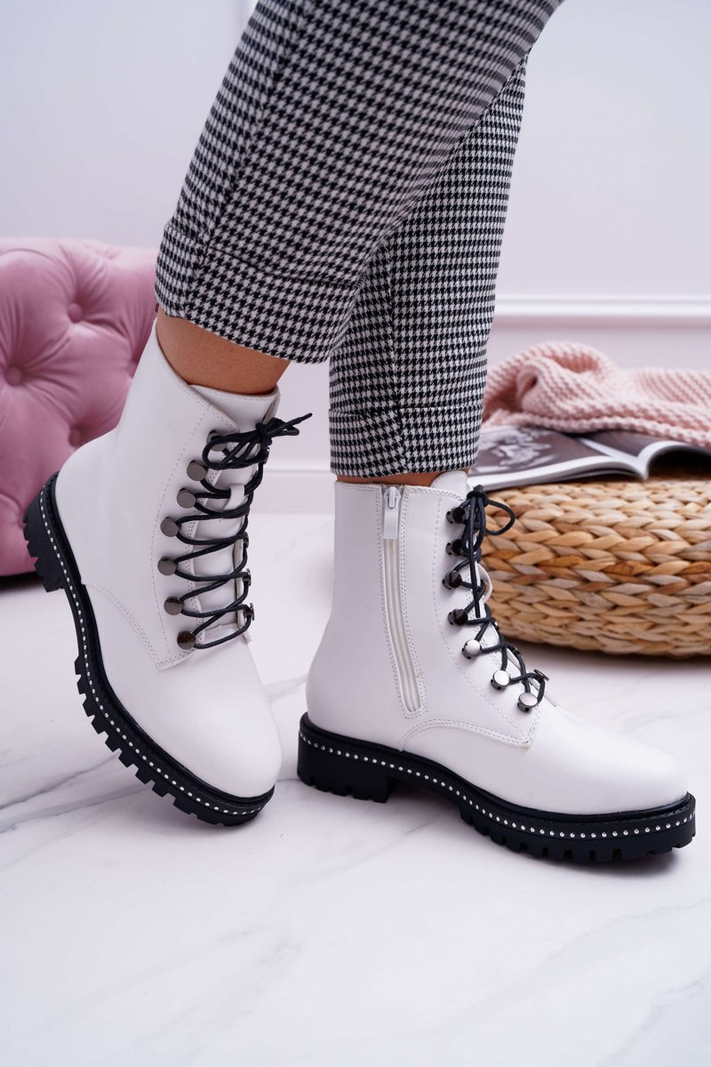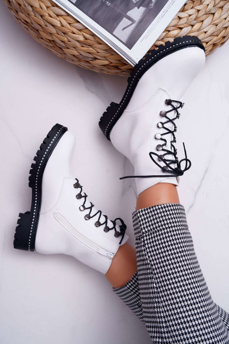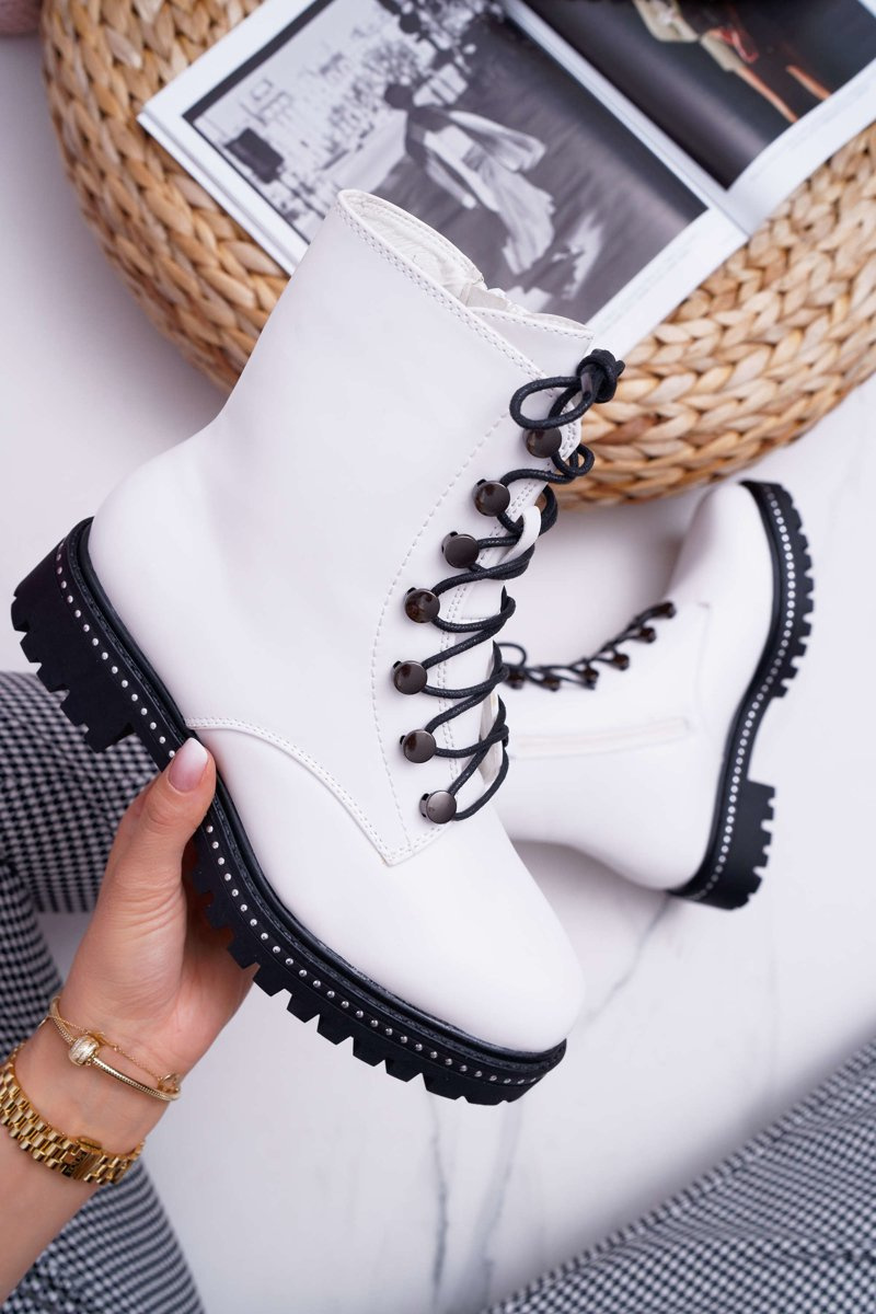 Botki Damskie Płaski Obcas Wysokie Glany Białe Buena