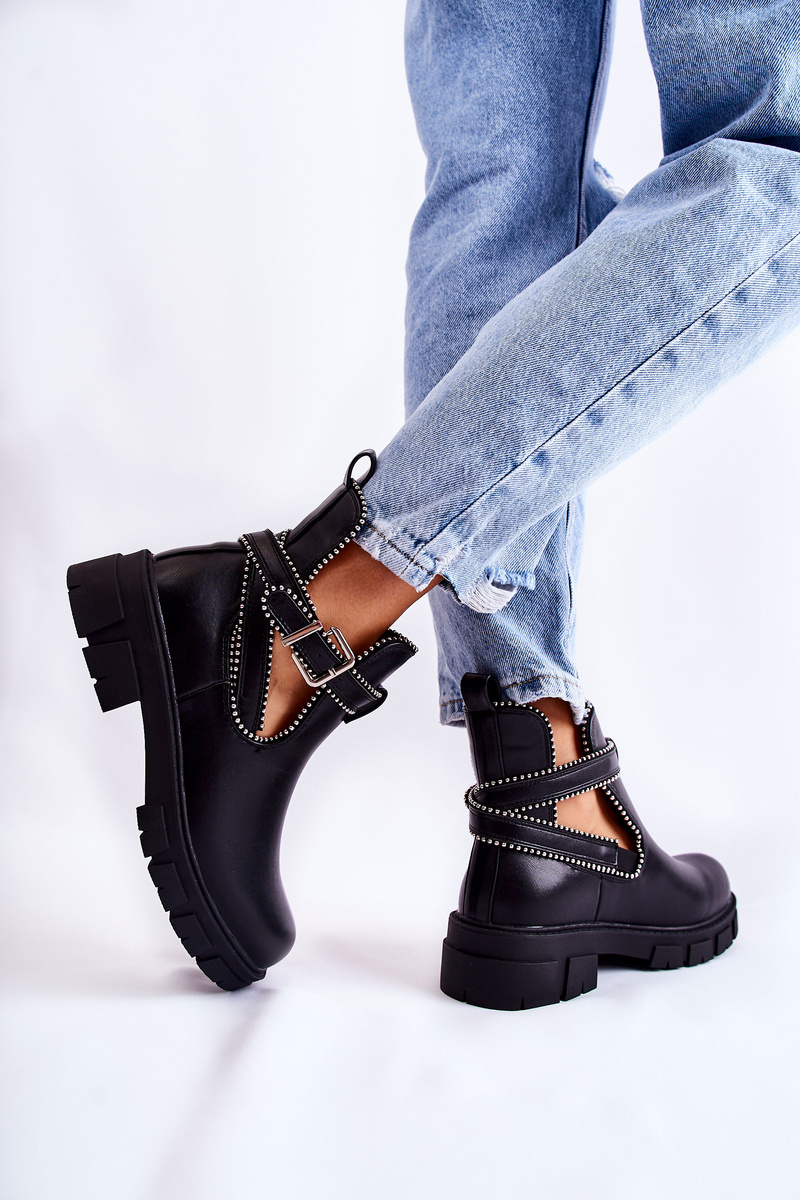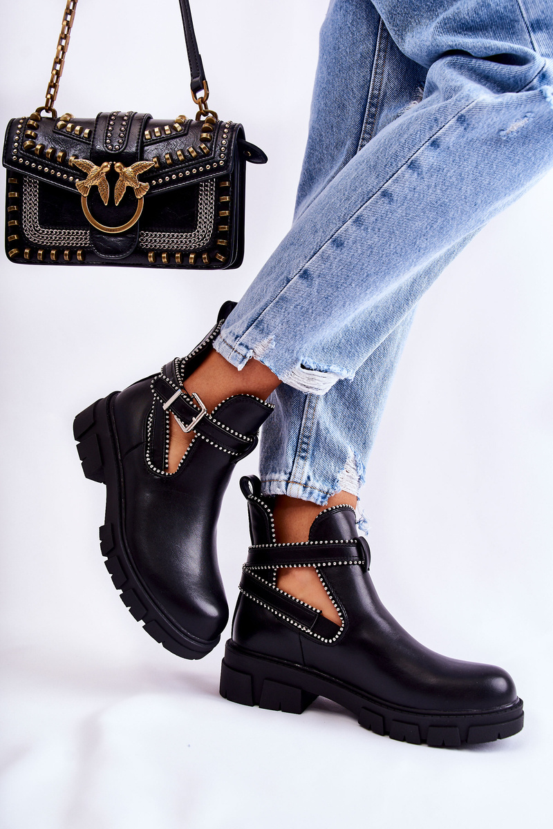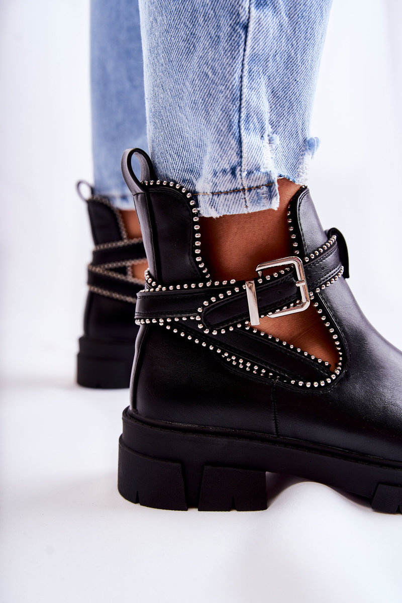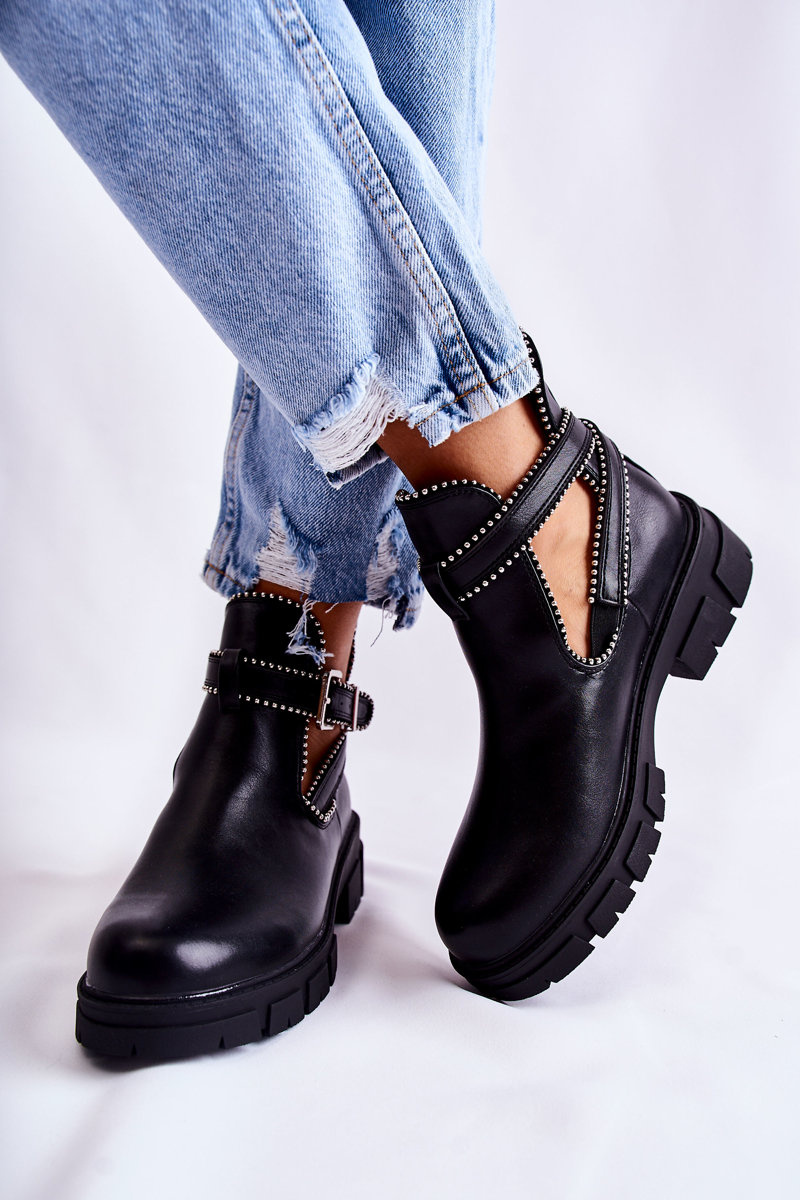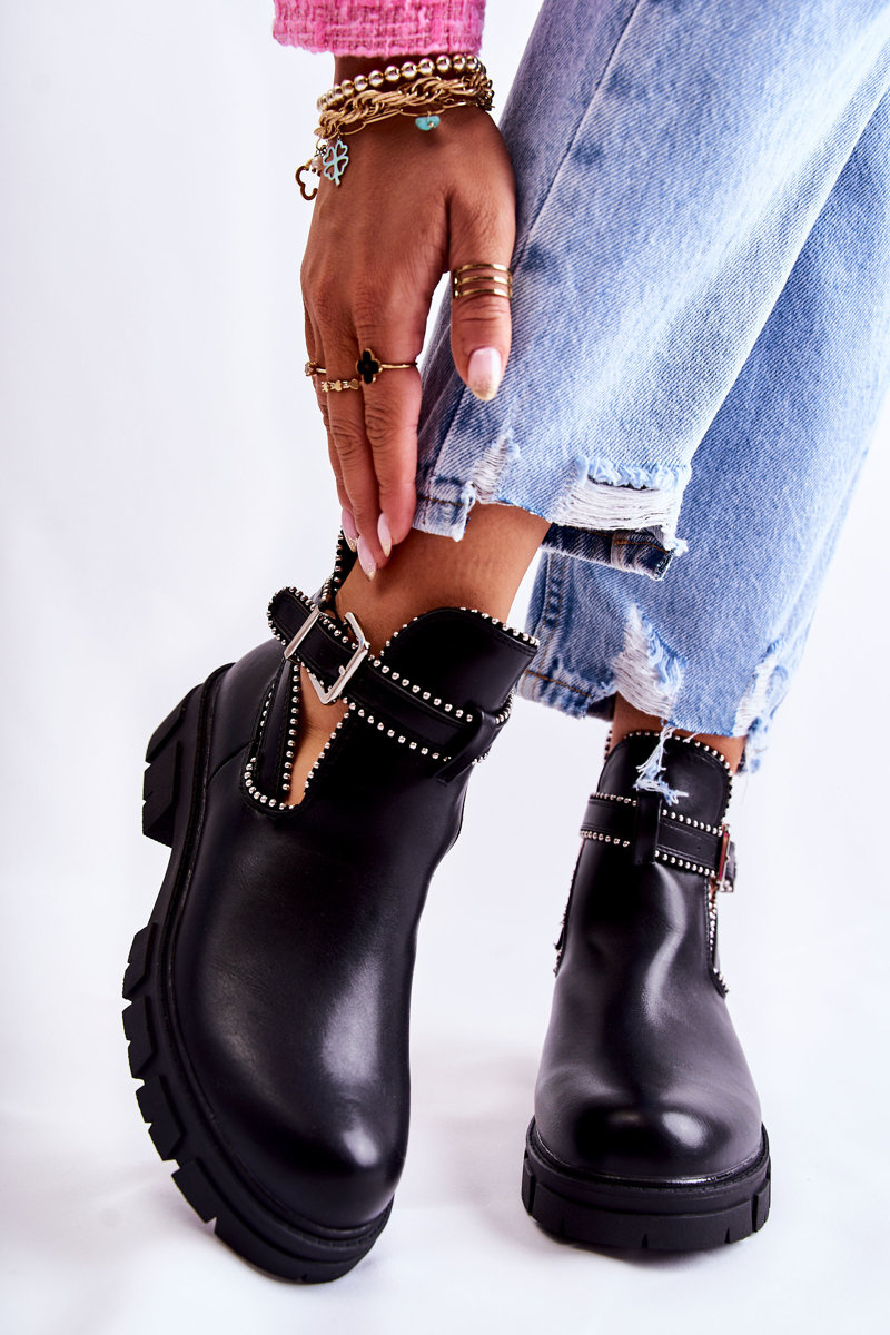Uwielbianym i najczęściej wybieranym modelem przez kobiety są botki na płaskim, stabilnym obcasie. Posiadają wiele atutów, jednak głównym z nich jest zapewnienie wysokiego komfortu podczas noszenia. Wykonane z wierzchu z eko skóry. Botki posiadają zapinanie na regulowany pasek ze sprzączką. Osadzone na delikatnej platformie z płaskim obcasem. Cholewka oraz paski zostały przyozdobione ćwiekami.