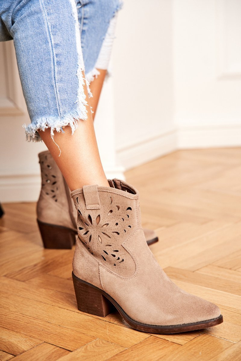 Botki to nie tylko buty na chłodne dni. Świetnie sprawdzą się również podczas tworzenia wiosennych stylizacjach. Botki posiadają zamek z boku cholewki ułatwiający zakładanie. W całości wykonane ze skóry zamszowej, co gwarantuje nam komfort oraz wysoką jakość wykonania. Idealne do zwiewnych sukienek oraz jeansowych spodni. Przy wyborze rozmiaru prosimy sugerować się tabelą rozmiarów.