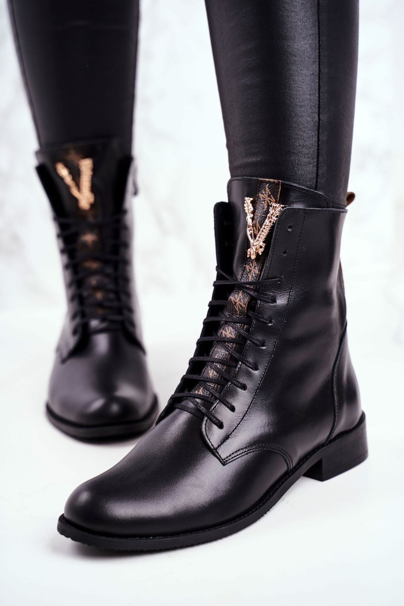 Botki to nie tylko buty na chłodne dni. Świetnie sprawdzą się również podczas tworzenia wiosennych stylizacji. Buty zostały wykonane z naturalnej skóry. Ocieplenie w postaci koca obuwniczego. Zdobienie w postaci złotej literki V wygląda przepięknie i podkreśla ich stylistykę. Zakładanie ułatwi wszyty na boku suwak, natomiast o lepsze dopasowanie zadbają sznurowadła. Botki oparte na delikatnym płaskim obcasie. Przy wyborze rozmiaru prosimy sugerować się tabelą rozmiarów.