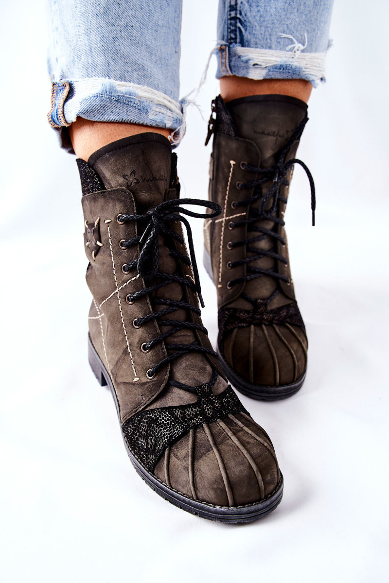 Botki Damskie Skórzane Ocieplane Maciejka Oliwkowe 03961-24