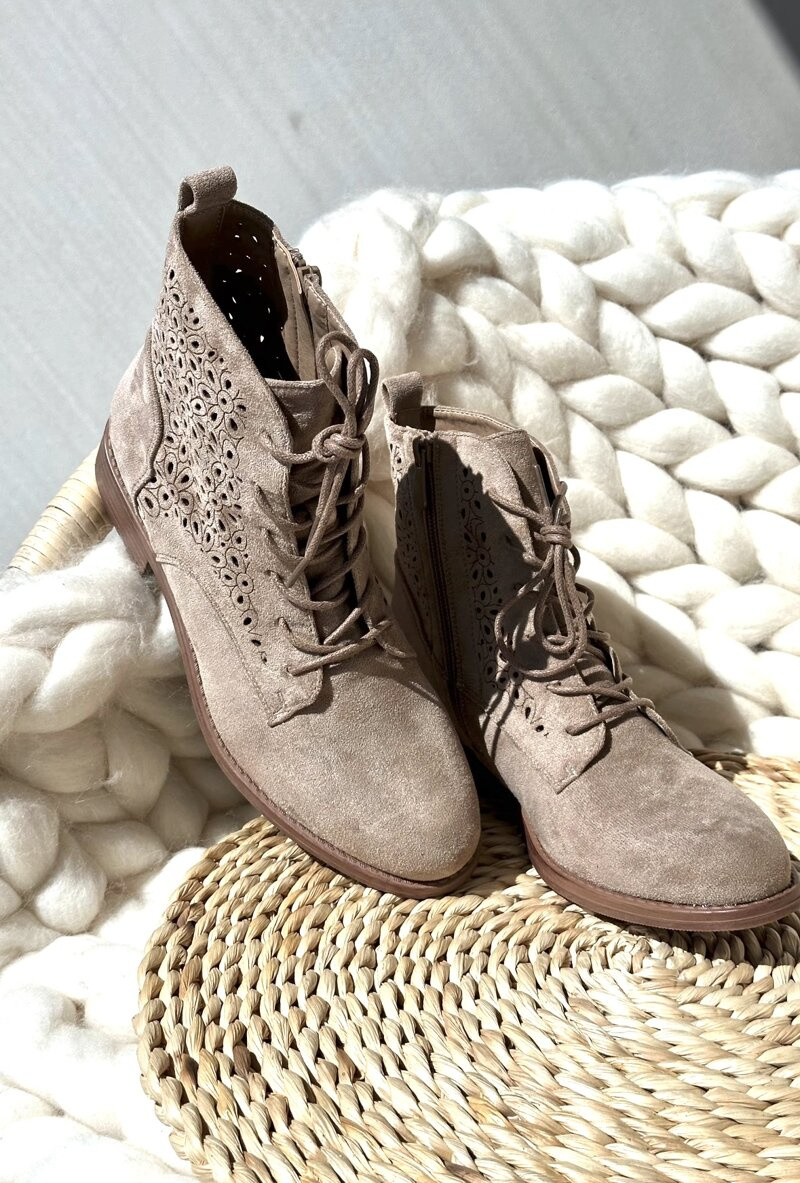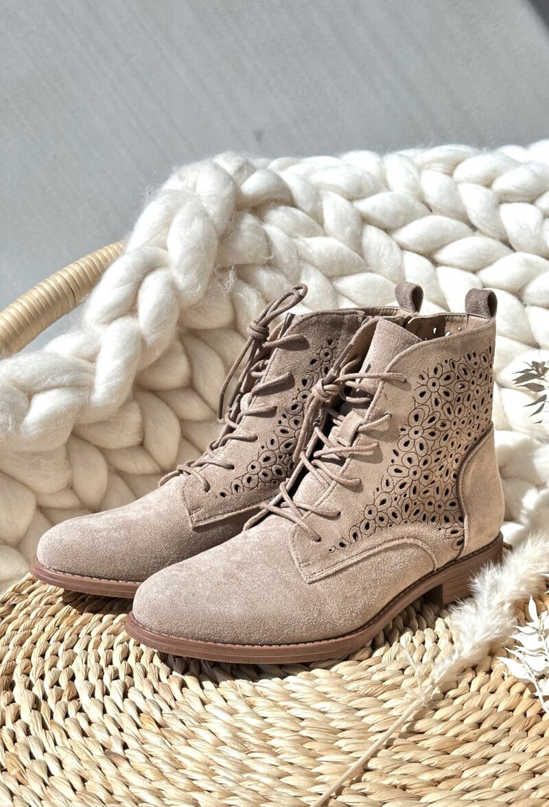 Uwielbianym i najczęściej wybieranym modelem przez kobiety są botki na płaskim, stabilnym obcasie. Posiadają wiele atutów, jednak głównym z nich jest zapewnienie wysokiego komfortu podczas noszenia. Wykonane z miłego w dotyku eko zamszu z ażurową cholewką z kwiatami. Zapinane na suwak z boku oraz dodatkowo posiadają sznurowanie. Noski zaokrąglone. Usztywniony zapiętek. Koniecznie powinnaś je mieć!