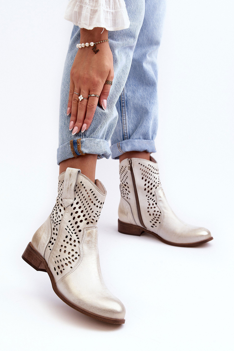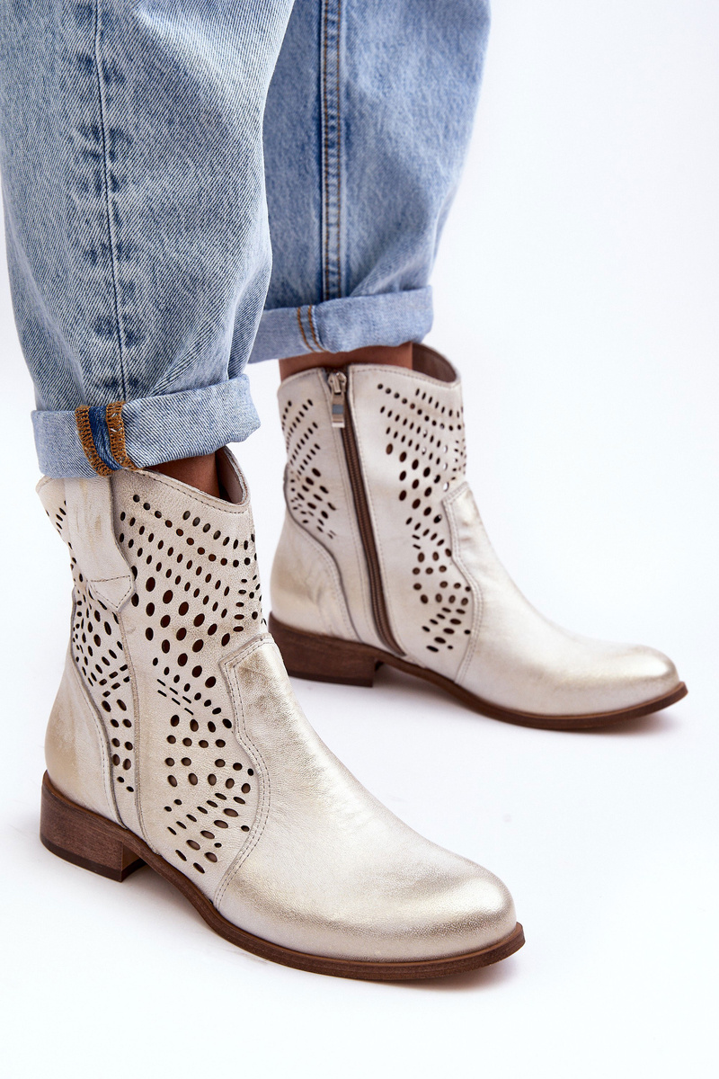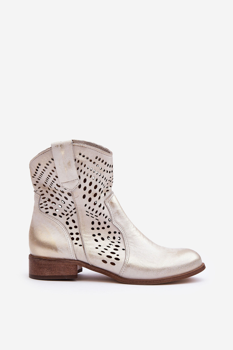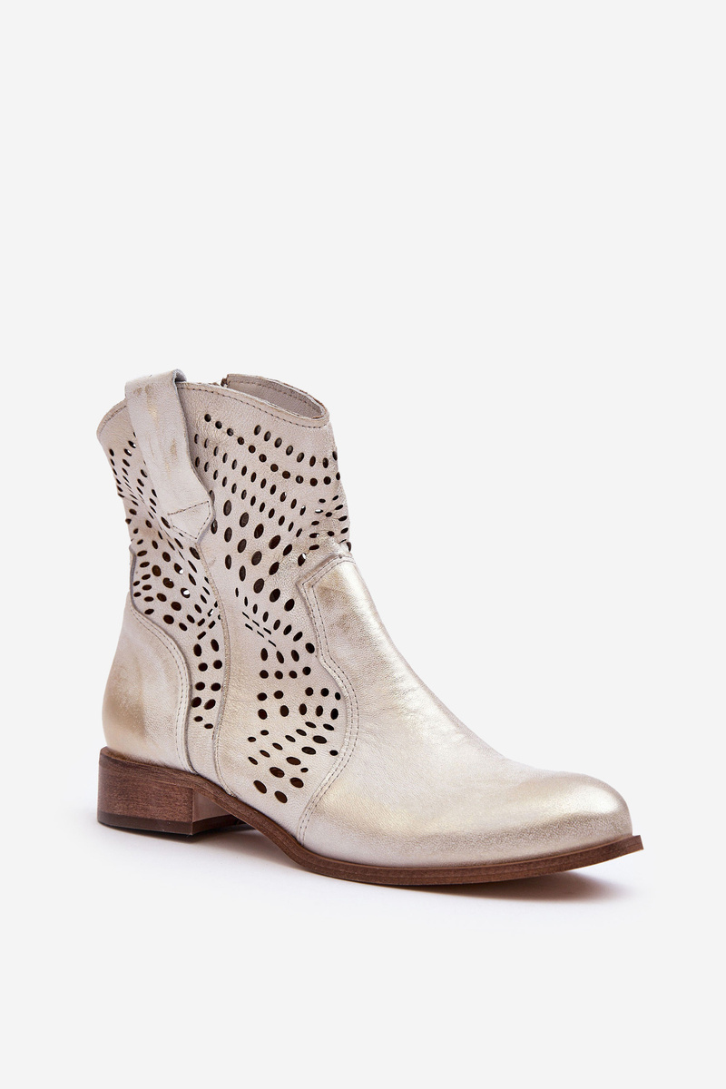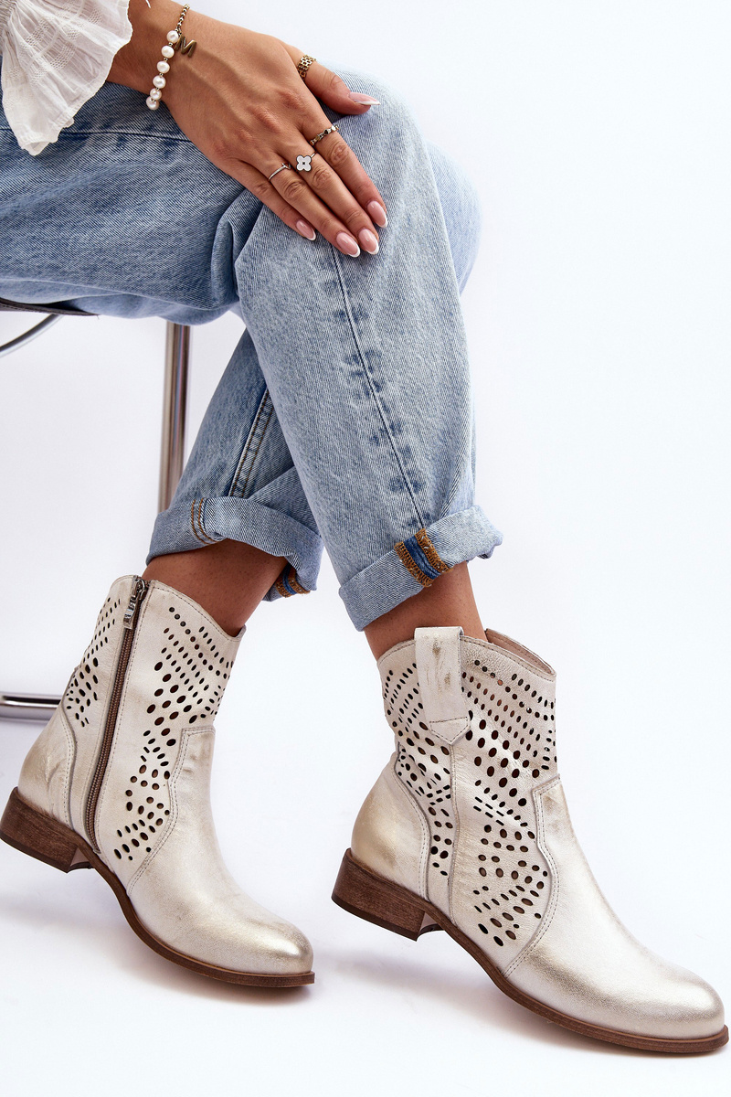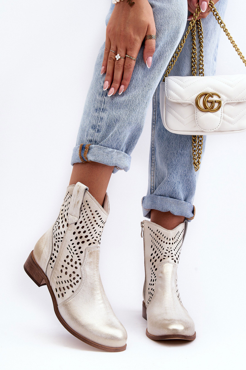 Botki Kowbojki Damskie Ażurowe Skóra Płaski Obcas Złote Zazoo 3305/2