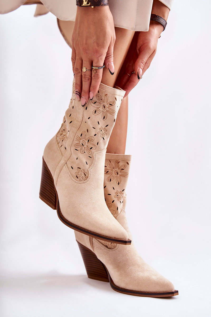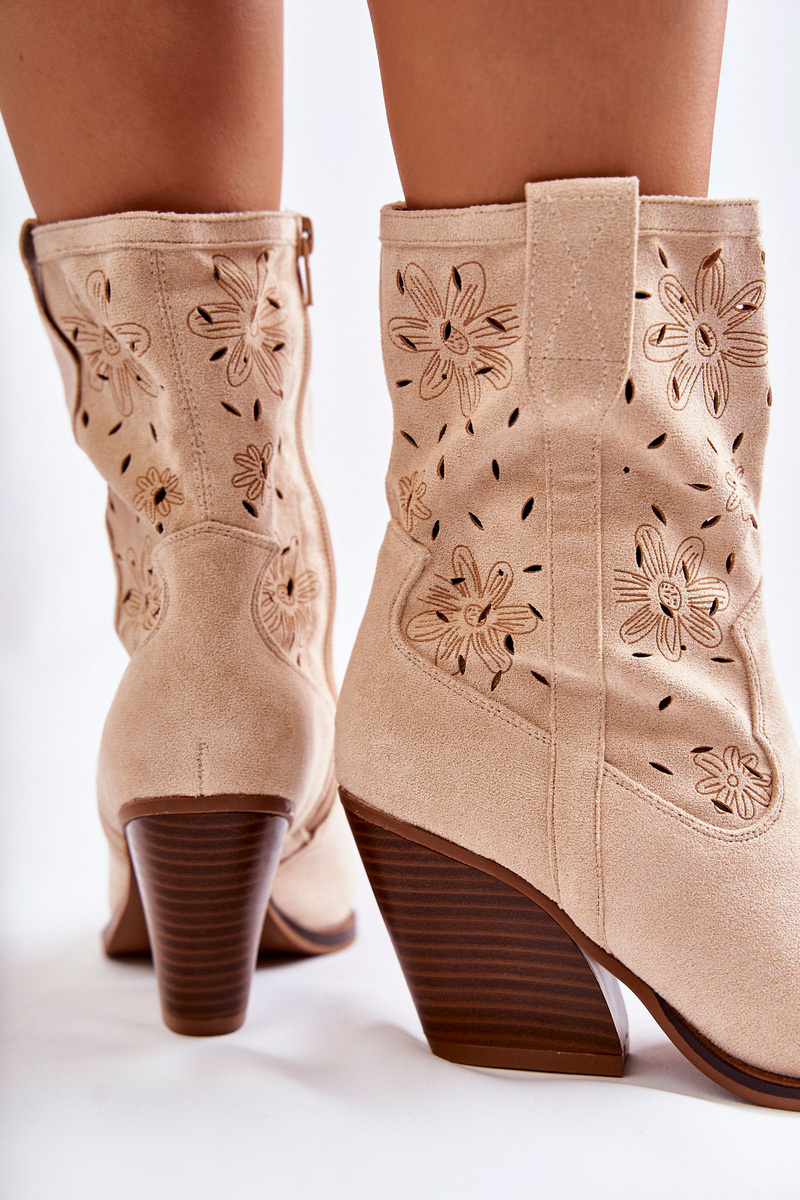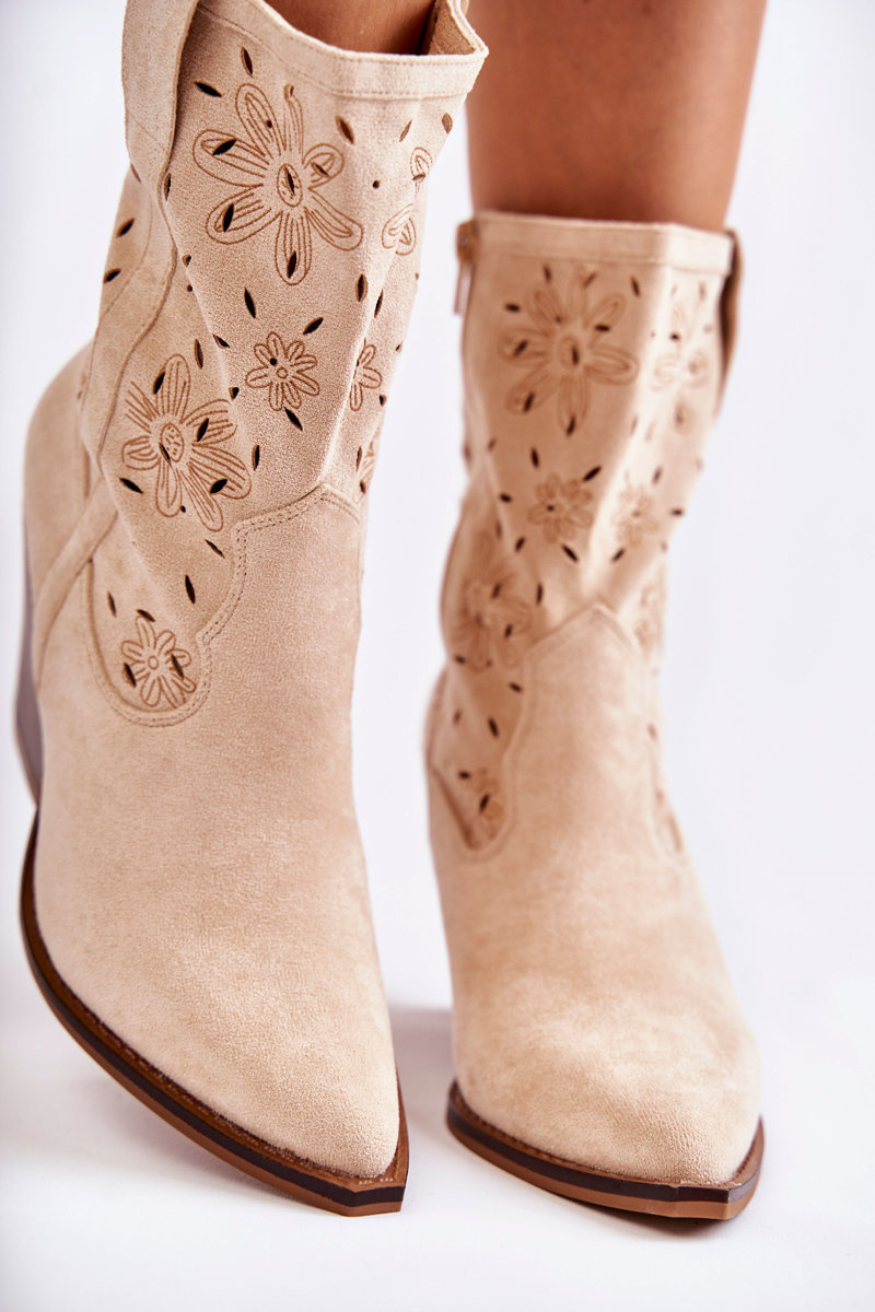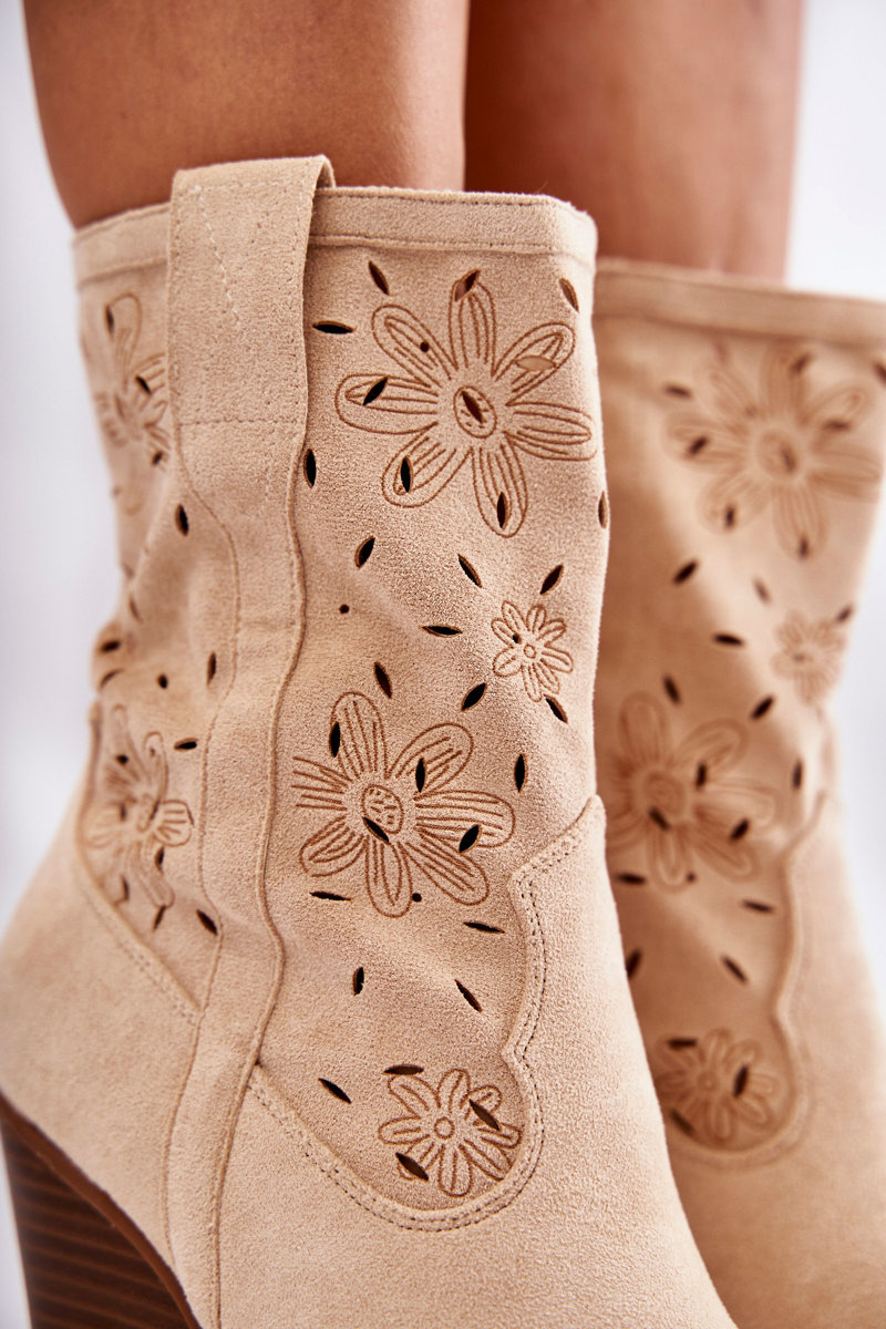 Botki Kowbojki Modne Zamsz Kwiaty Beżowe Coralie