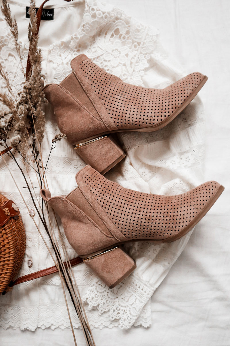 Uwielbianym i najczęściej wybieranym modelem przez kobiety są botki na płaskim, stabilnym obcasie. Posiadają wiele atutów, jednak głównym z nich jest zapewnienie wysokiego komfortu podczas noszenia. Wykonane z eko zamszu w ażurowy wzorek. Buty dopasują się do tęgości nogi, dzięki elastycznej gumce w cholewce. Ozdobny element przy obcasie idealnie komponuje się z całością. Botki są wsuwane.