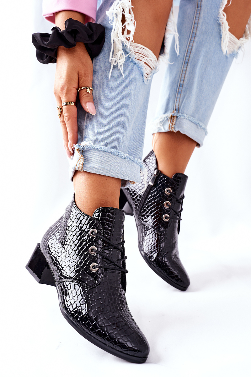 Damskie botki na obcasie. Zwierzęca faktura oraz lakierowanie sprawia, że wyglądało obłędnie. Ocieplenie w postaci koca obuwniczego.Przy wyborze rozmiaru prosimy sugerować się tabelą rozmiarów.