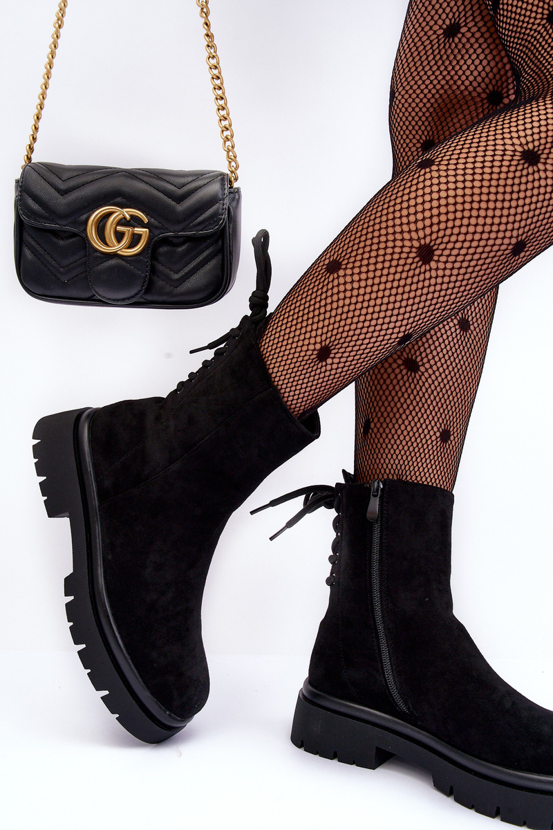Botki Płaski Obcas Zamsz Sznurowanie Czarne Lakyta NS273P