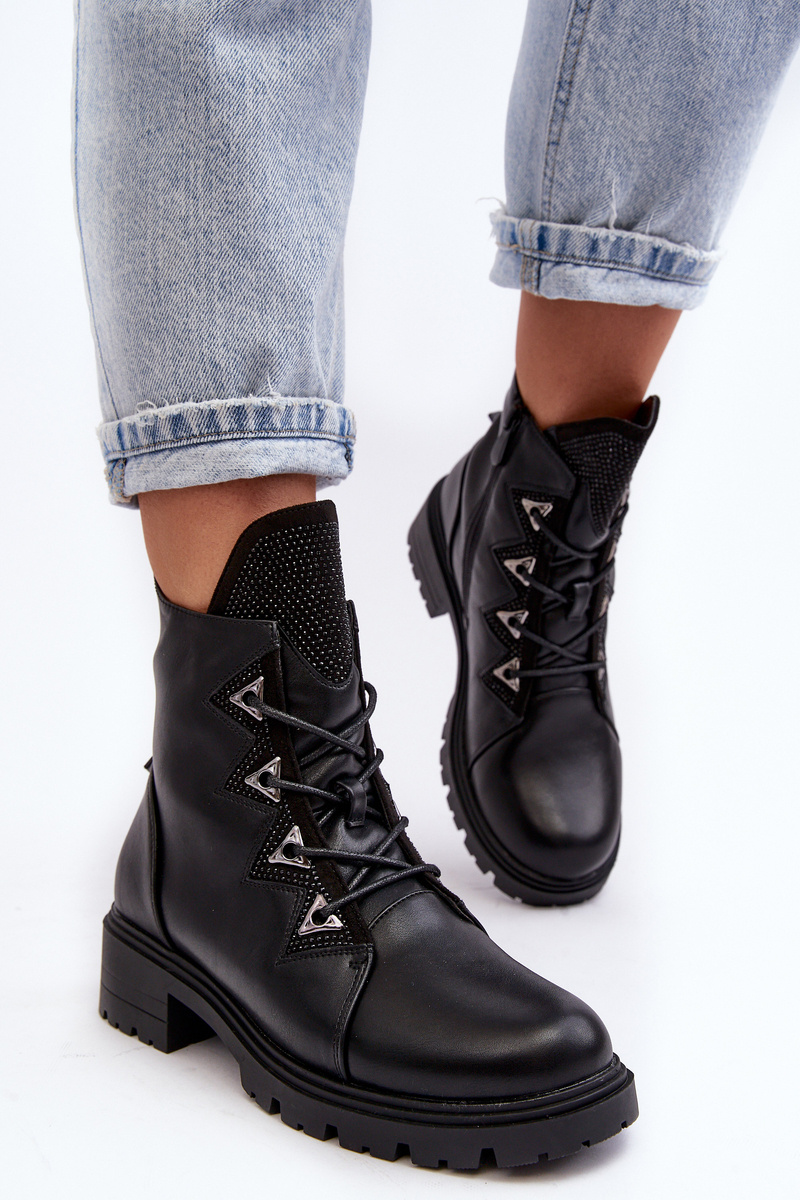 Uwielbianym i najczęściej wybieranym modelem przez kobiety są botki na płaskim, stabilnym obcasie. Posiadają wiele atutów, jednak głównym z nich jest zapewnienie wysokiego komfortu podczas noszenia. Wykonane z lakierowanej eko skóry. Modny fason ze sznurowaniem i suwakiem z boku cholewki. Zapiętek usztywniany. Ozdobne dżety przy sznurowadłach oraz na języku dodają tym butom charakteru. Posiadają w środku ocieplenie w postaci koca obuwniczego.
