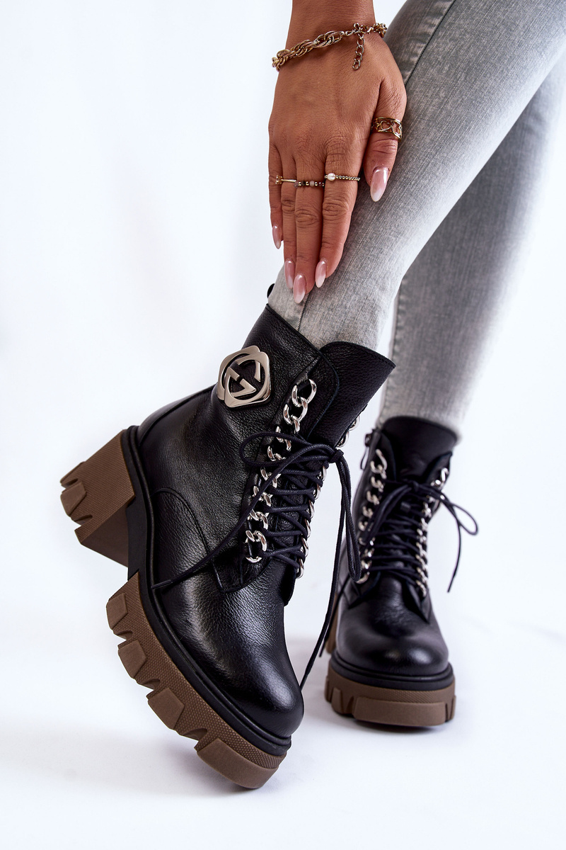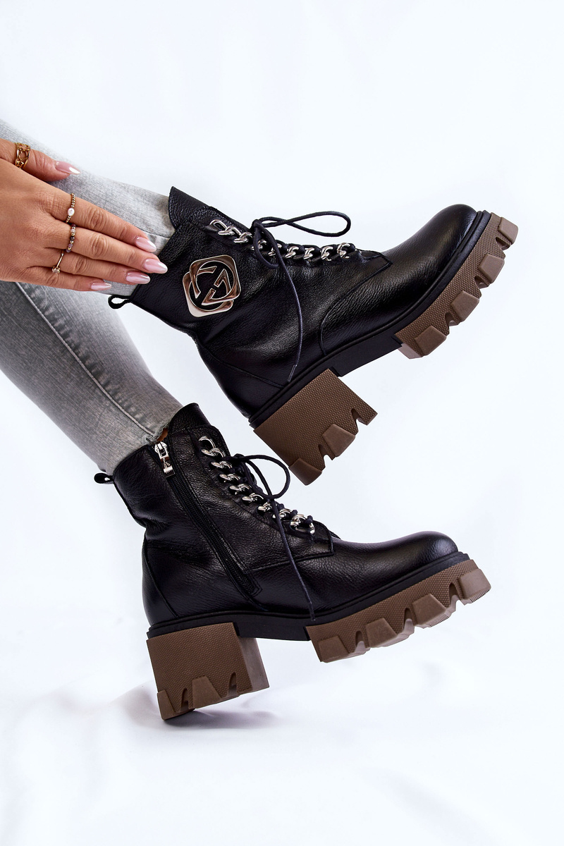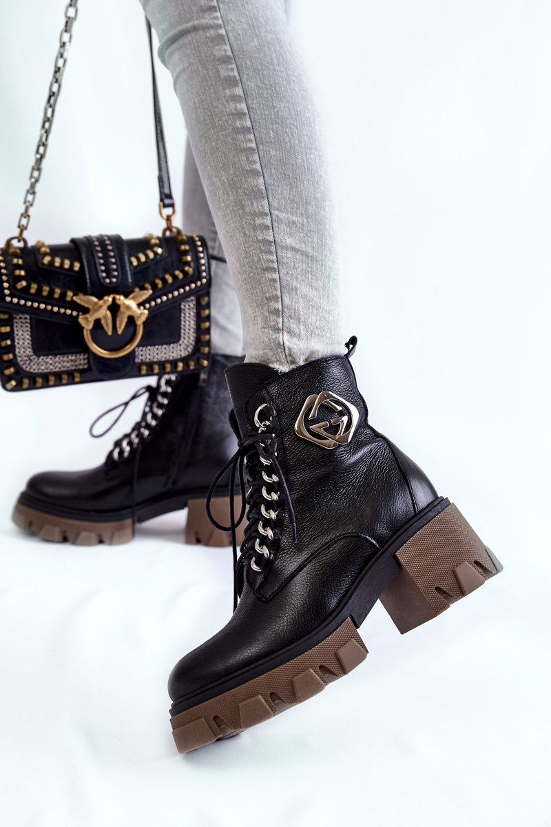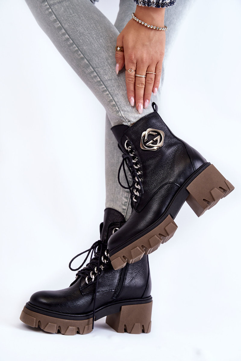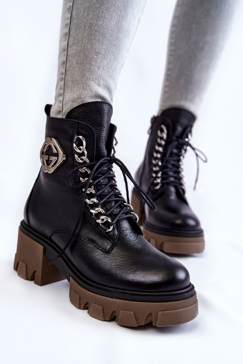 Uwielbianym i najczęściej wybieranym modelem przez kobiety są botki na płaskim, stabilnym obcasie. Posiadają wiele atutów, jednak głównym z nich jest zapewnienie wysokiego komfortu podczas noszenia. Wykonane z wysokiej jakości naturalnych skór. Model ten posiada klasyczne sznurowanie przyozdobione metalowymi kółeczkami oraz suwak z boku cholewki. Model osadzony na masywnym, płaskim obcasie i platformie ze żłobieniami. Botki dodatkowo posiadają ozdobny element z boku cholewki oraz usztywniany zapiętek. Ocieplone kocem obuwniczym.