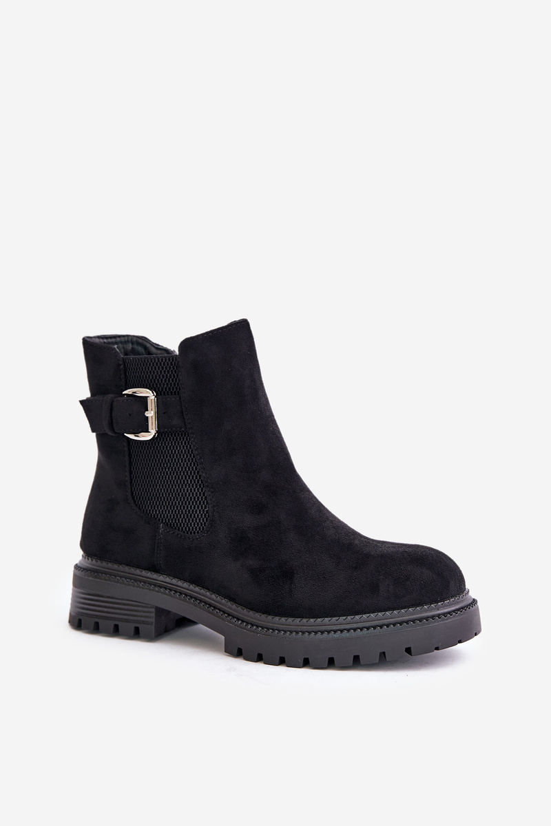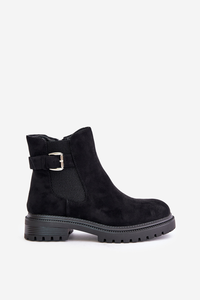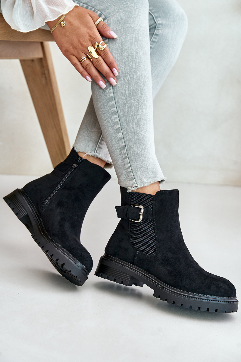 Uwielbianym i najczęściej wybieranym modelem przez kobiety są botki na płaskim, stabilnym obcasie. Posiadają wiele atutów, jednak głównym z nich jest zapewnienie wysokiego komfortu podczas noszenia. Sztyblety wykonane z eko zamszu. Zapinane na zamek, co ułatwi zakładanie i zdejmowanie obuwia. Noski zaokrąglone. Środek ocieplany kocem obuwniczym. Na cholewce pasek z klamrą.