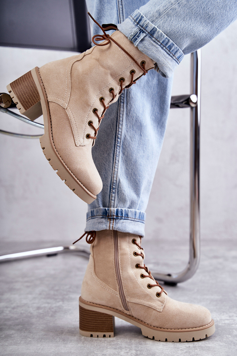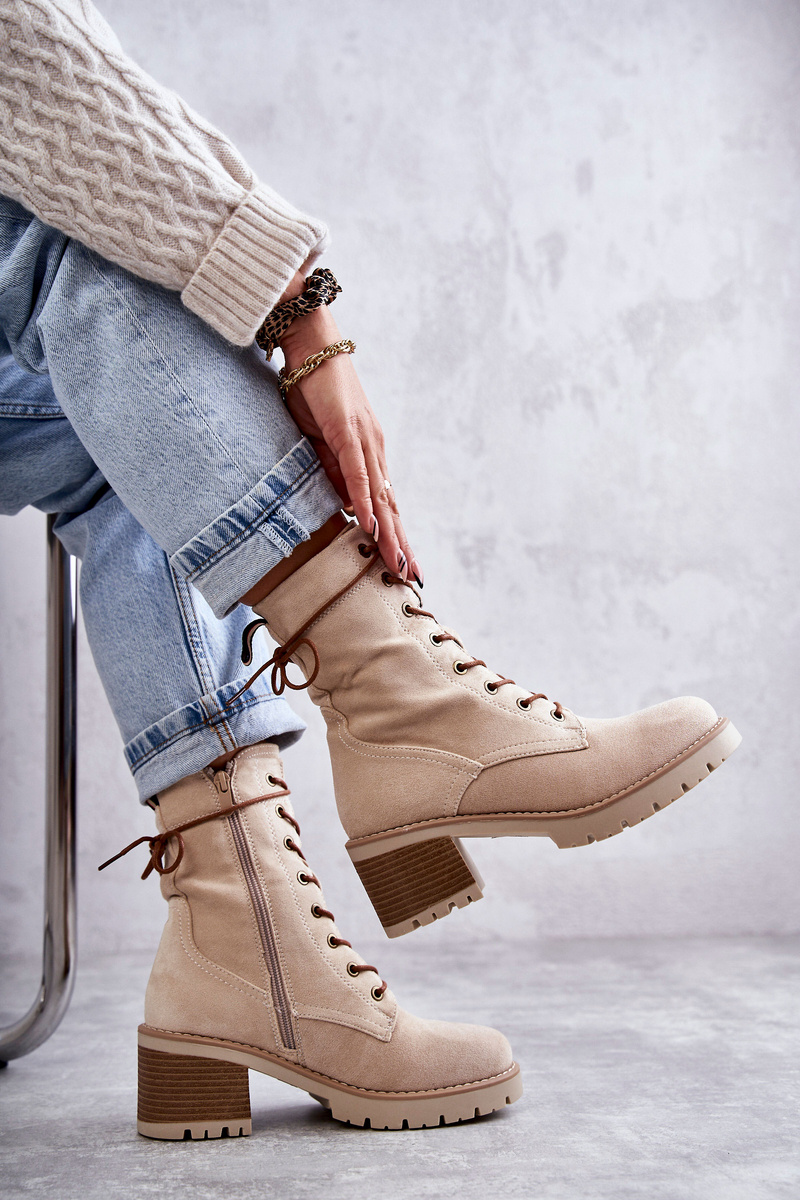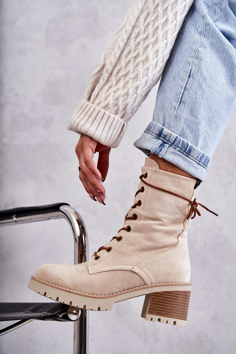 Botki Trapery Damskie Ocieplane Obcas Beżowe Julieta