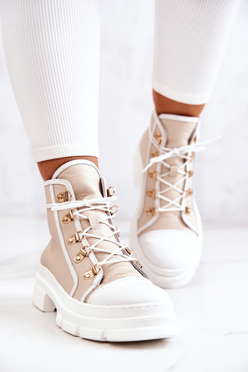 Botki Trapery Skórzane Wiązane Beżowo-Białe Letty