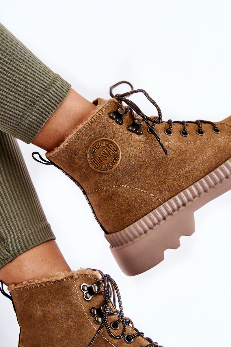 Uwielbianym i najczęściej wybieranym modelem przez kobiety są botki na płaskim, stabilnym obcasie. Posiadają wiele atutów, jednak głównym z nich jest zapewnienie wysokiego komfortu podczas noszenia. Zostały wykonane z wierzchu z naturalnego zamszu. Posiadają w środku ocieplenie z materiału tekstylnego. Z boku znajduje się logo marki Big Star. Trapery zostały osadzone na płaskim obcasie i platformie. Model sznurowany. Zapiętek jest usztywniany. Botki posiadają także wzmacniany nosek.
